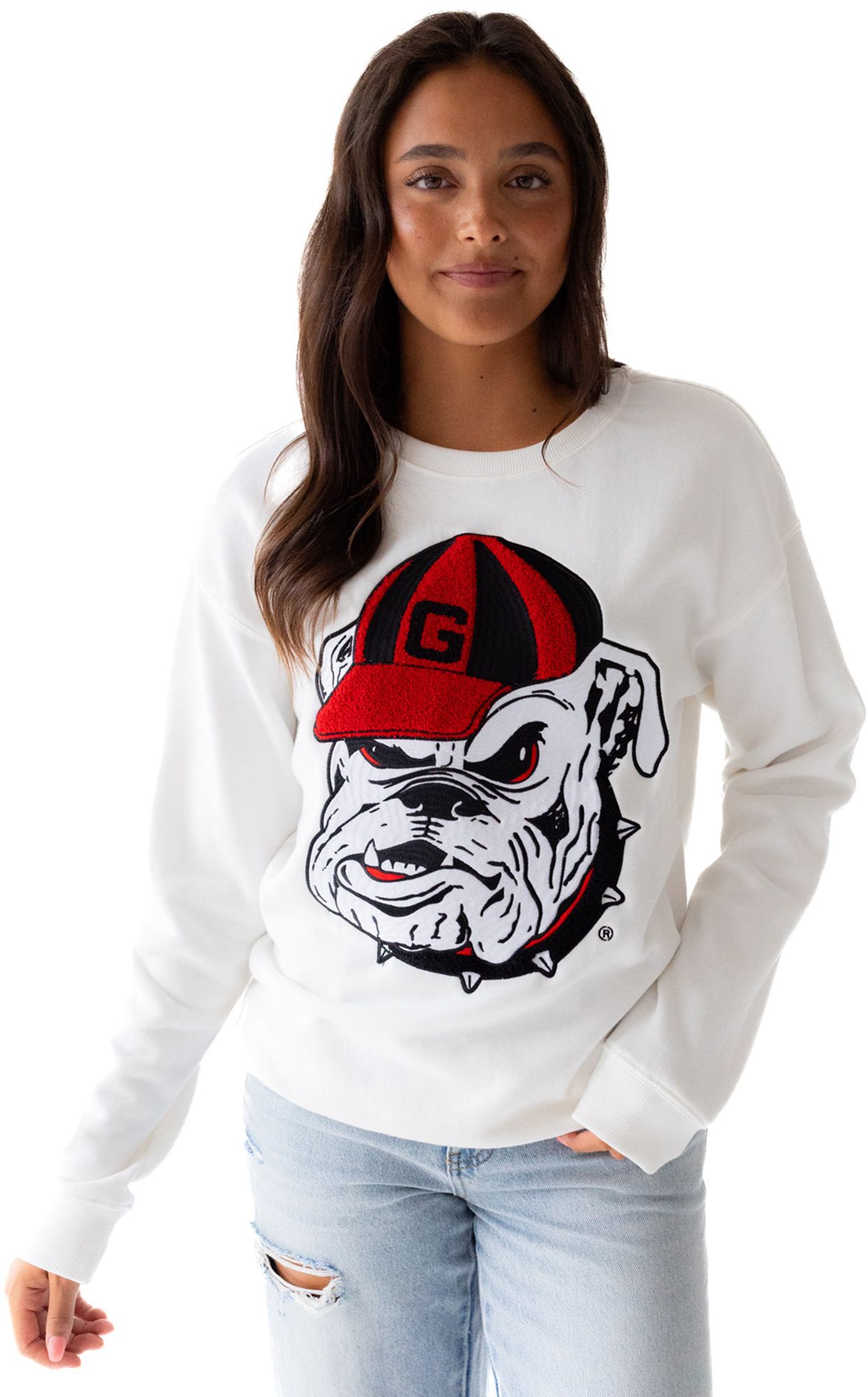 Gameday Social Women's Georgia Bulldogs White Chenille Mascot Crewneck Sweatshirt