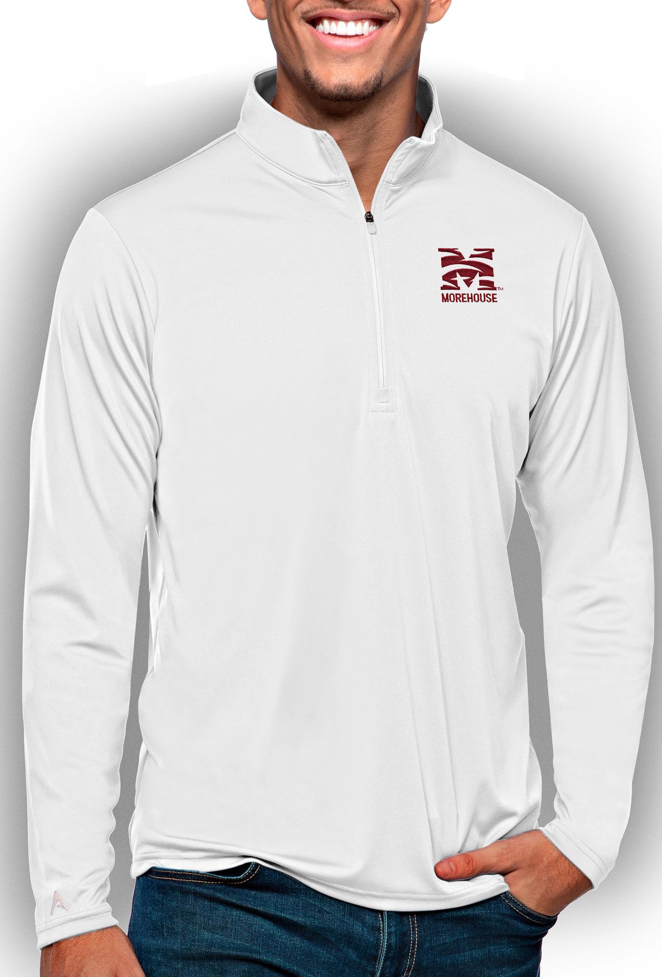 Antigua Men's Morehouse College Maroon Tigers White Tribute 1/4 Zip Jacket
