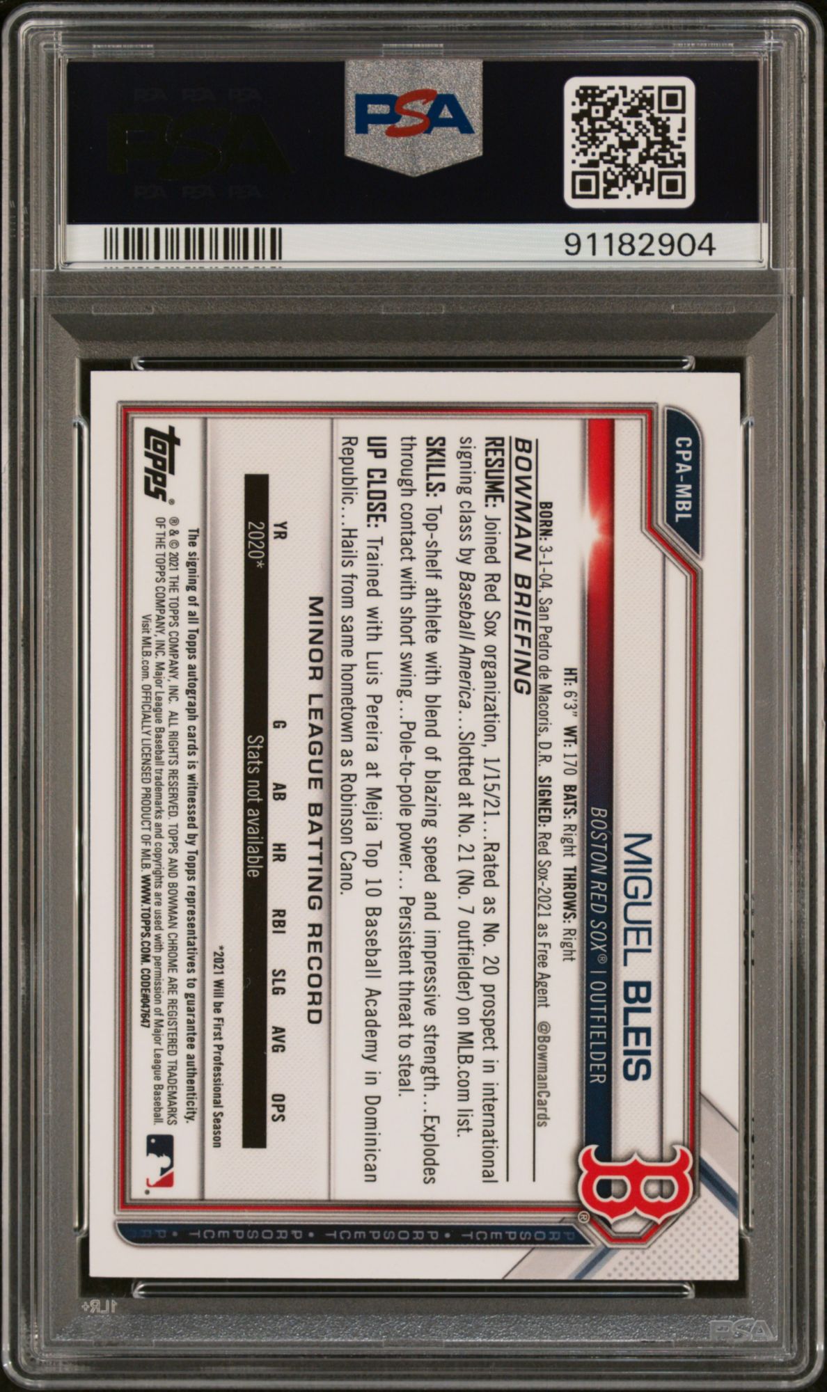 A PSA Mint 9 is a superb condition card that exhibits only one of the following minor flaws: a very slight wax stain on reverse, a minor printing imperfection or slightly off white borders. Centering must be approximately 60/40 or better on the front and 90/10 or better on the reverse
