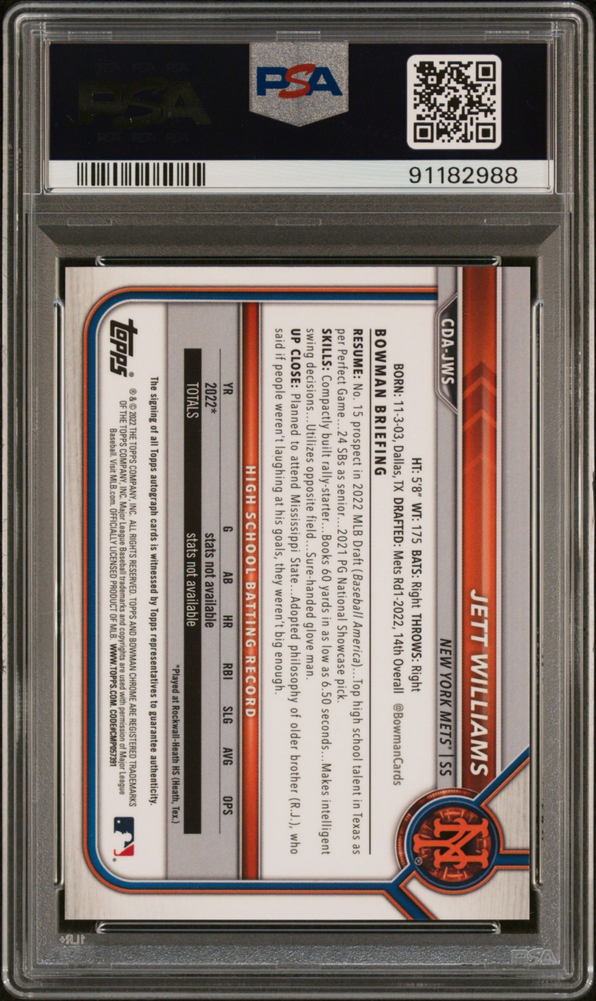 2022 Bowman Draft Chrome Draft Pick Autographs Jett Williams Blue Wave Refractor PSA 10