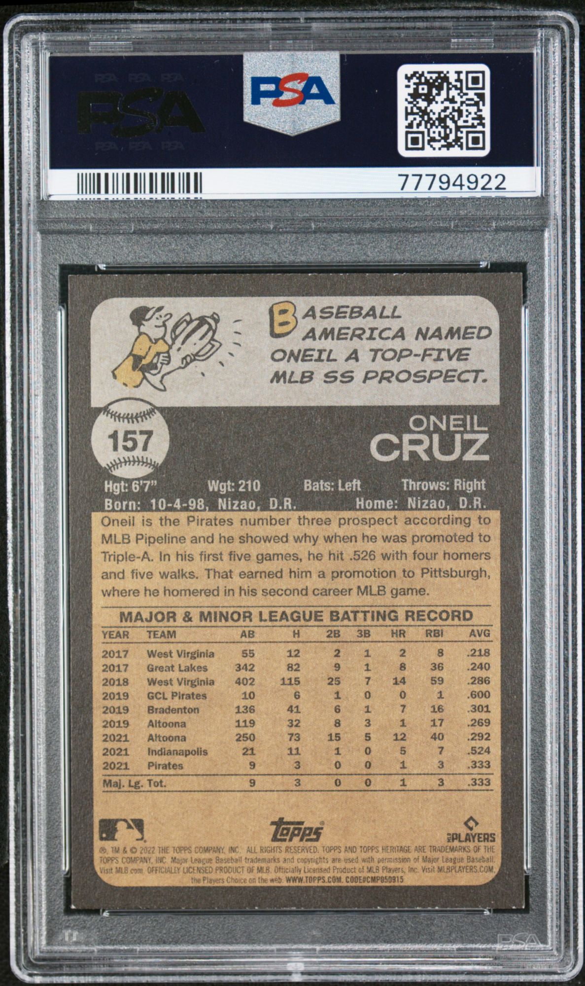 A PSA Mint 9 is a superb condition card that exhibits only one of the following minor flaws: a very slight wax stain on reverse, a minor printing imperfection or slightly off white borders. Centering must be approximately 60/40 or better on the front and 90/10 or better on the reverse