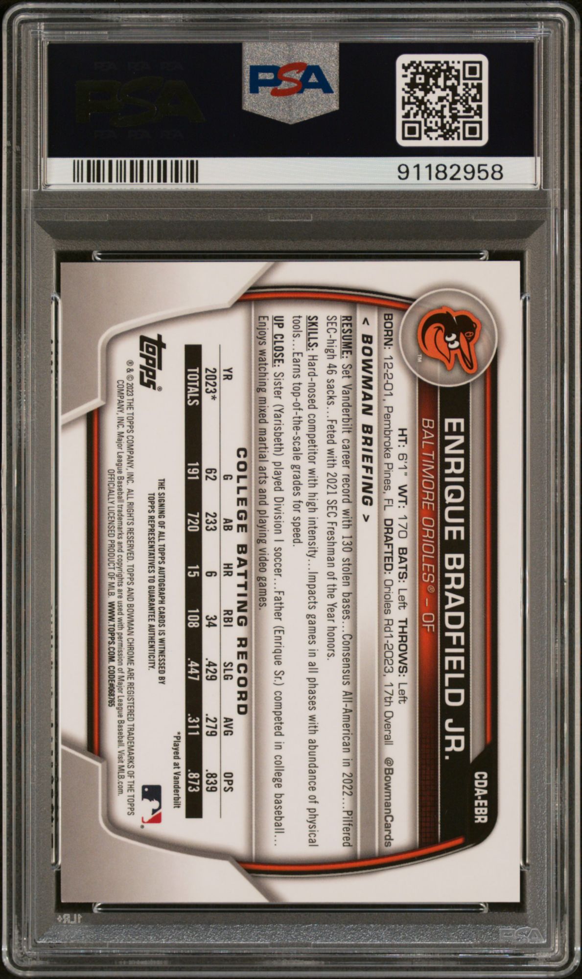 2023 Bowman Draft Chrome Prospect Autograph Enrique Bradfield Jr. PSA 10