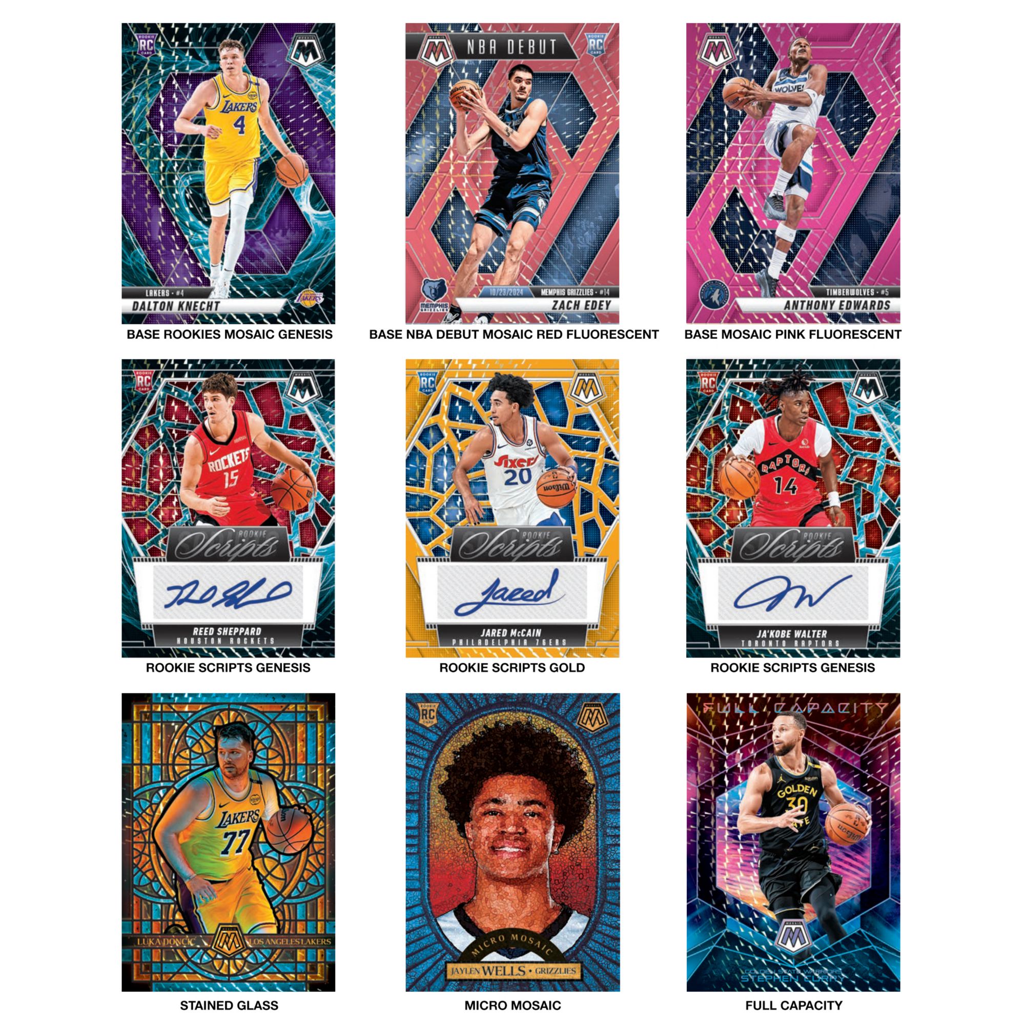 Collectors can find the returning Mega Box-Exclusive parallels, Mosaic Reactive Blue and Pink Fluorescent (#’d/10), as well as the new exclusive Mosaic Purple Fluorescent (#’d/249) and Red Fluorescent (#’d/75) parallels for sets Base, Base Rookies, Base NBA Debut, Base City Edition and Base NBA Greats