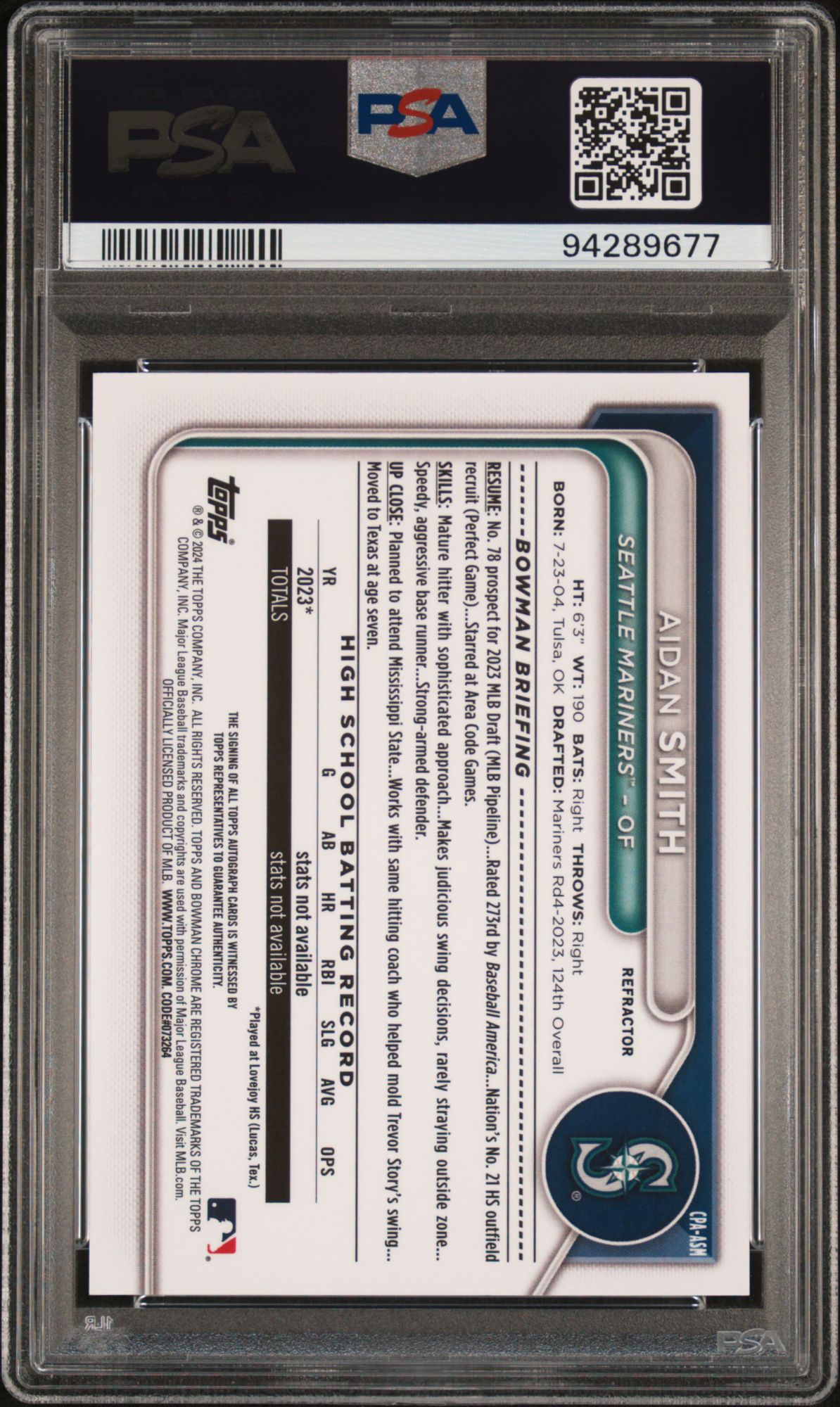 2024 Bowman Chrome Prospect Autographs Aidan Smith Refractor PSA 10