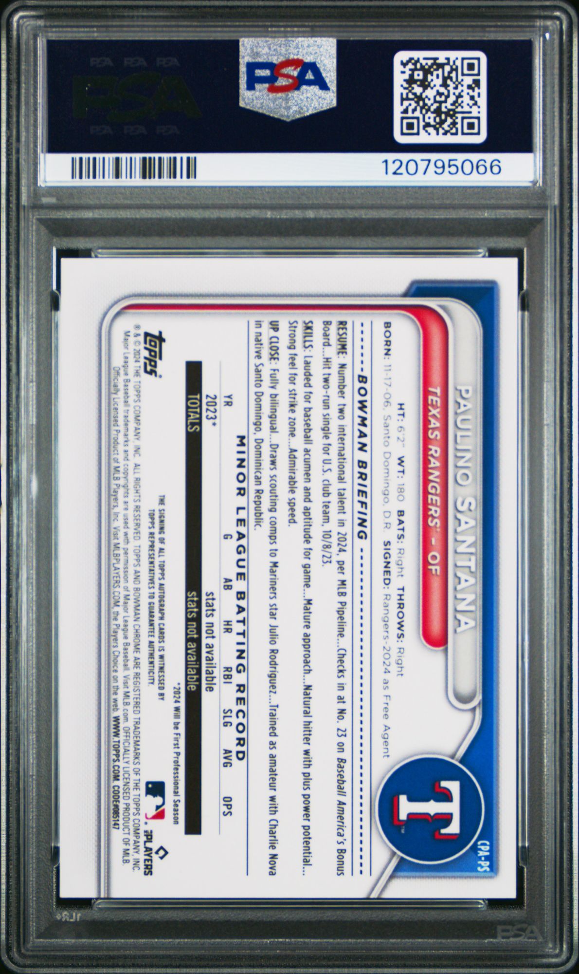 2024 Bowman Chrome Prospect Autographs CPAPS Paulino Santana Blue Raywave PSA 10