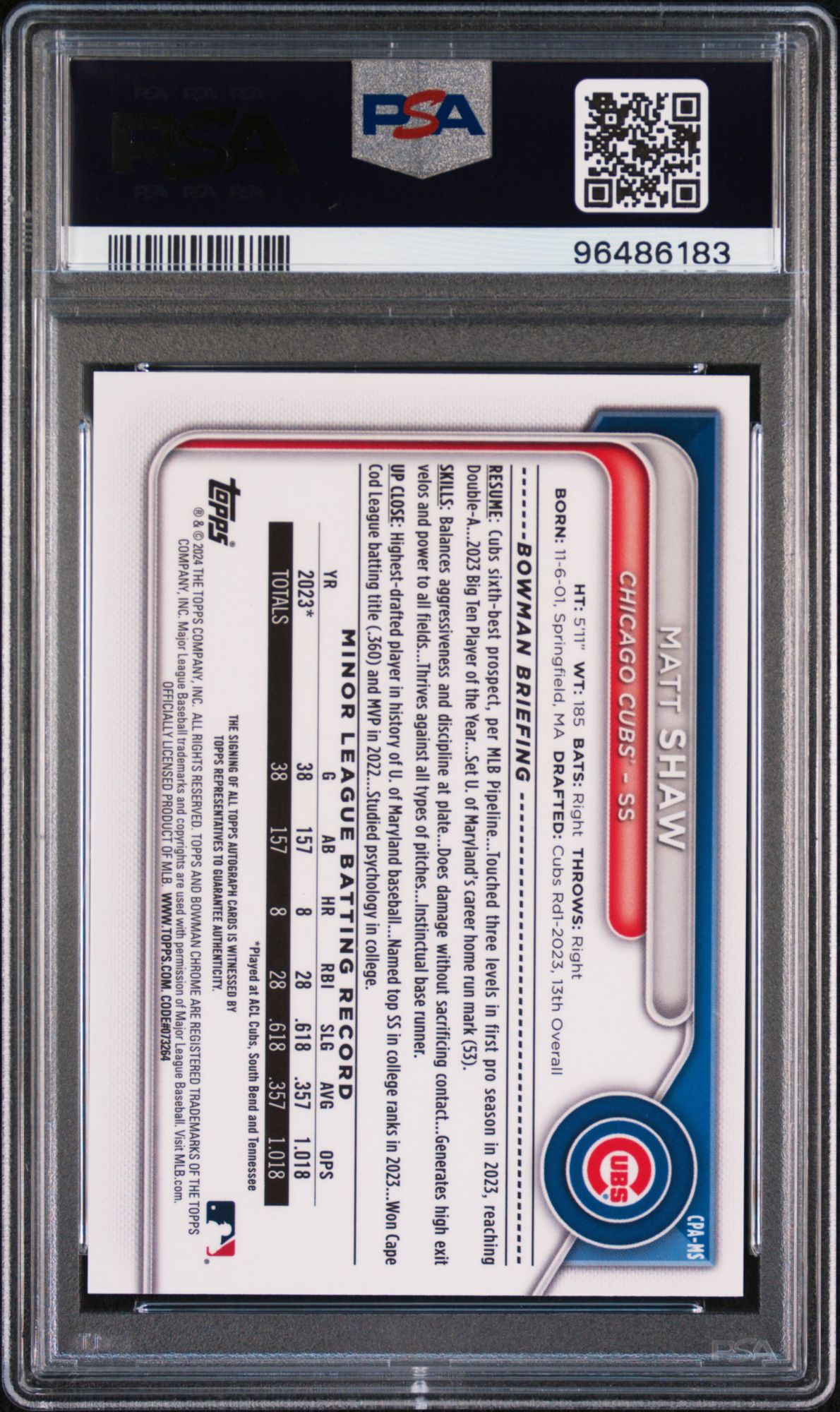 2024 Bowman Chrome Prospect Autographs Matt Shaw Gold Refractor PSA 9