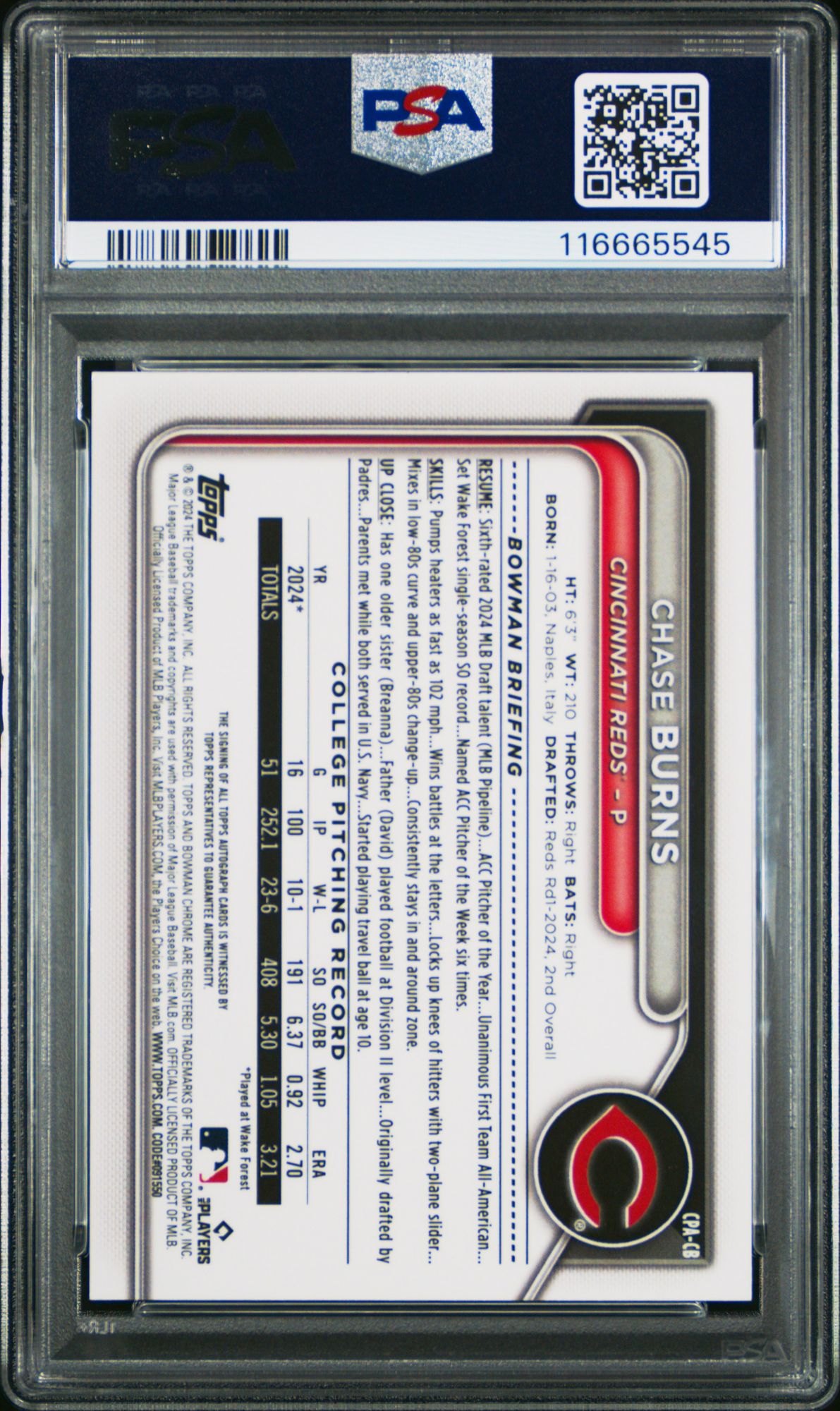 2024 Bowman Draft Chrome Prospect Autographs Chase Burns Blue Wave PSA 9