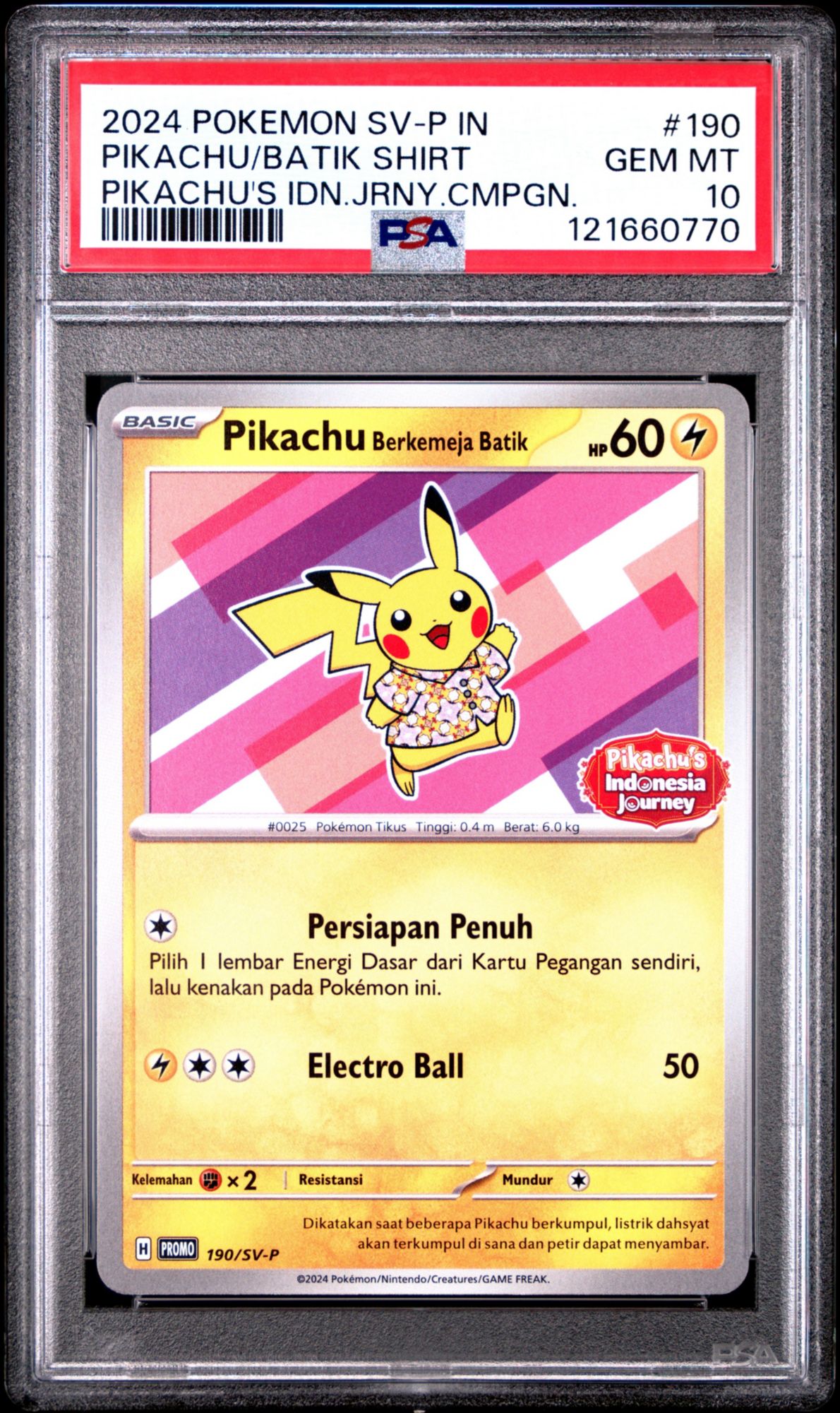 2024 Pokemon Indonesian Sv-p Promo 190 Pikachu In Batik Shirt Pikachu's Indonesia Journey Campaign PSA 10