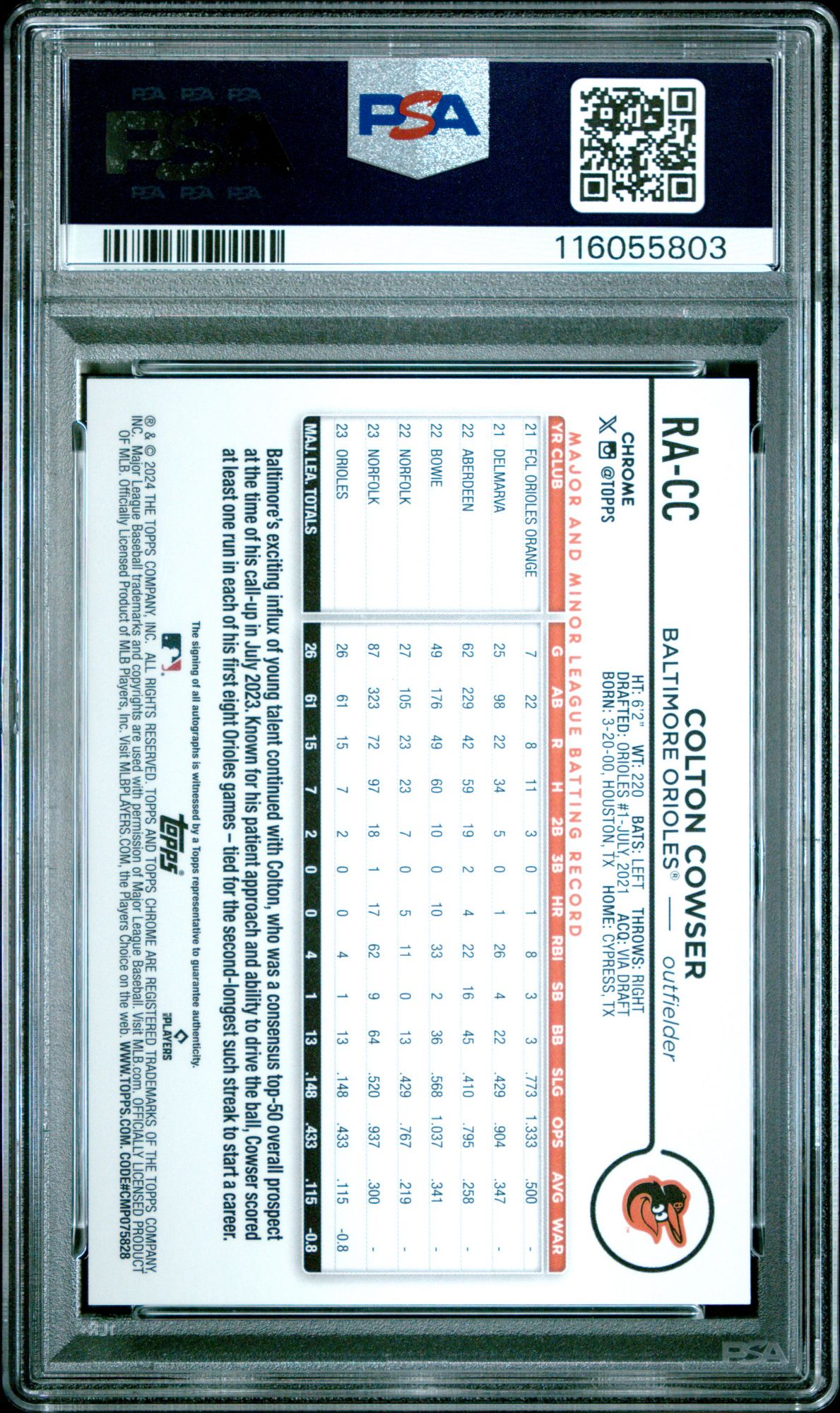 2024 Topps Chrome Rookie Autographs Colton Cowser Purple Refractor PSA 10