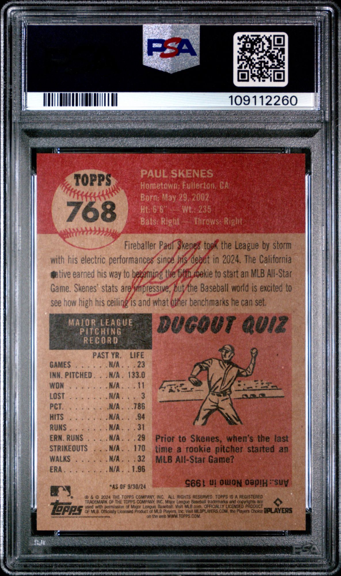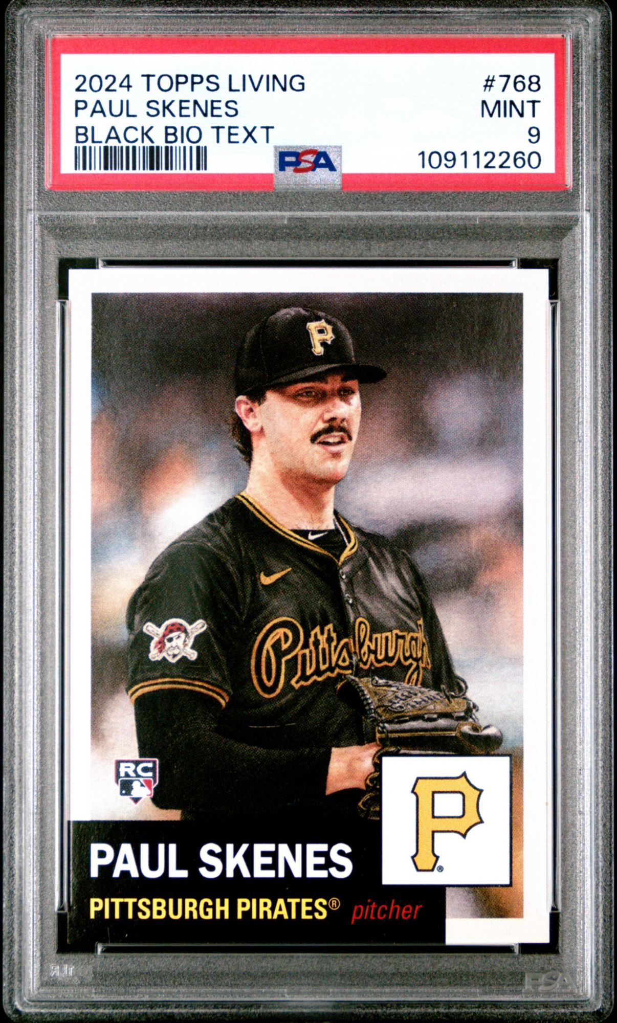 A PSA Mint 9 is a superb condition card that exhibits only one of the following minor flaws: a very slight wax stain on reverse, a minor printing imperfection or slightly off white borders. Centering must be approximately 60/40 or better on the front and 90/10 or better on the reverse