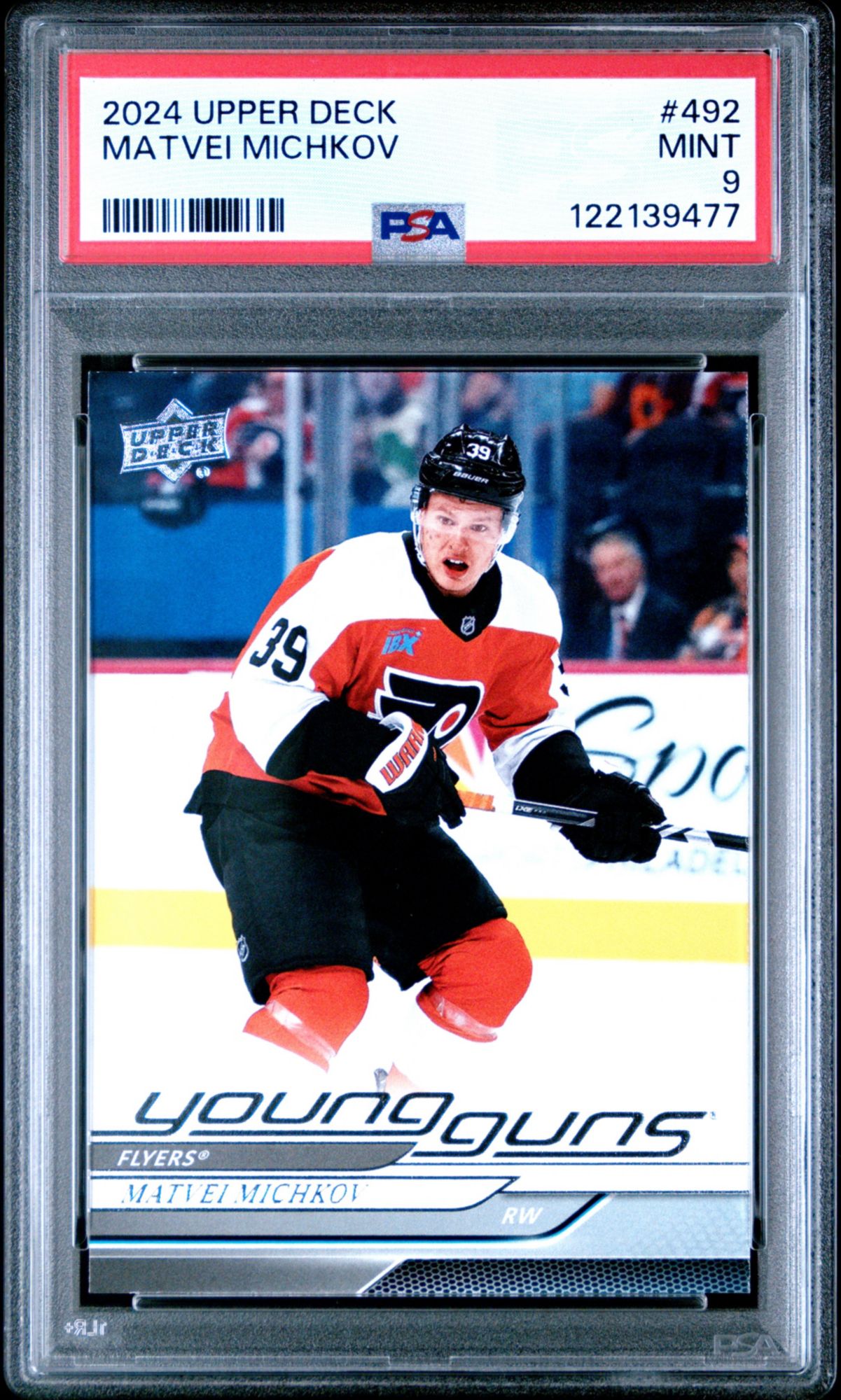 A PSA Mint 9 is a superb condition card that exhibits only one of the following minor flaws: a very slight wax stain on reverse, a minor printing imperfection or slightly off white borders. Centering must be approximately 60/40 or better on the front and 90/10 or better on the reverse