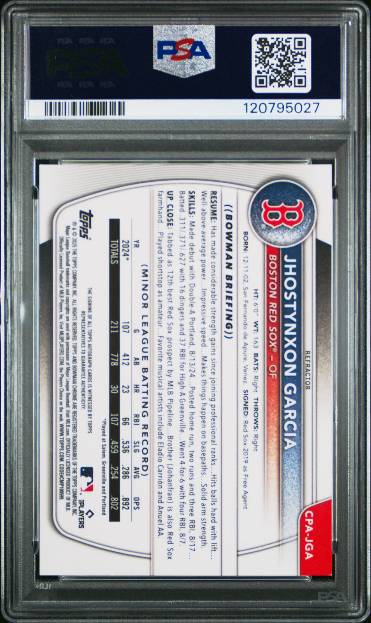2025 Bowman Chrome Prospect Autographs CPAJGA Jhostynxon Garcia PSA 10