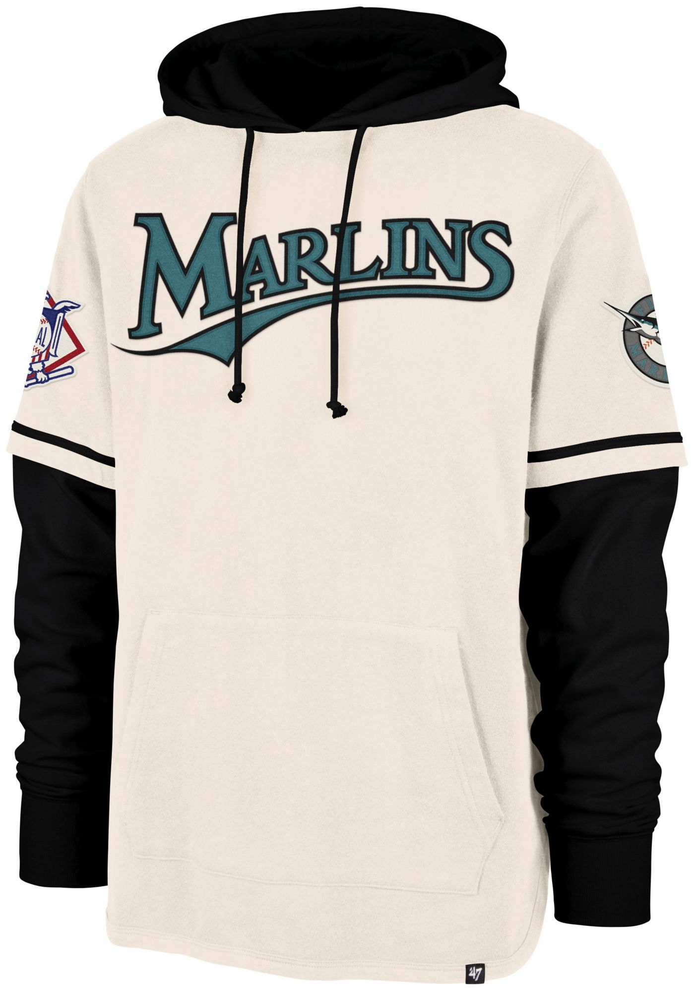 This style runs big, we recommend going a size down. The Trifecta '47 Shortstop Pullover is made from midweight fleece with a soft, brushed interior. It features contrast sleeves and hood for a layered look. This uniform inspired silhouette has twill appliques across the chest featuring official wordmarks and team logos.