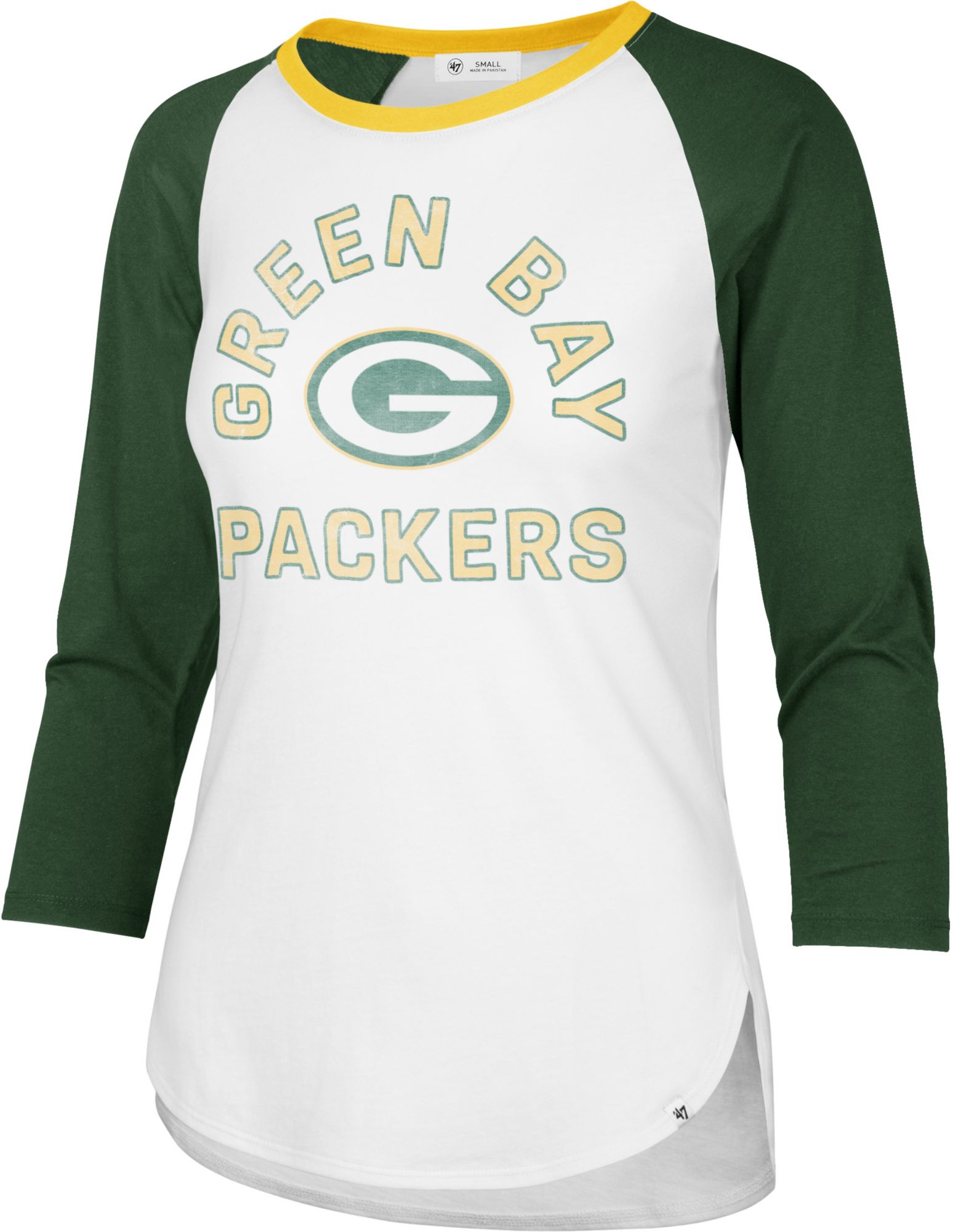 ‘47 Women's Green Bay Packers White Wash Raglan Three-Quarter Sleeve T-Shirt