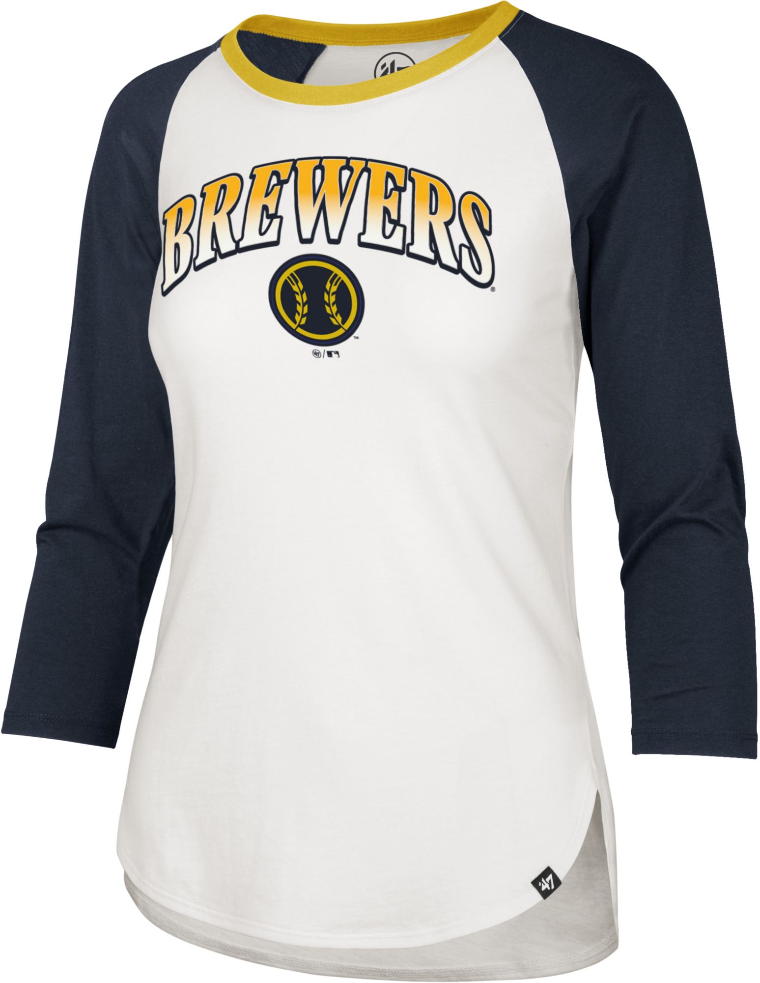 Stay stylish this season in a classic baseball tee with a feminine twist in the ‘47® Women’s Milwaukee Brewers Splitter Raglan Three-Quarter Sleeve T-Shirt.