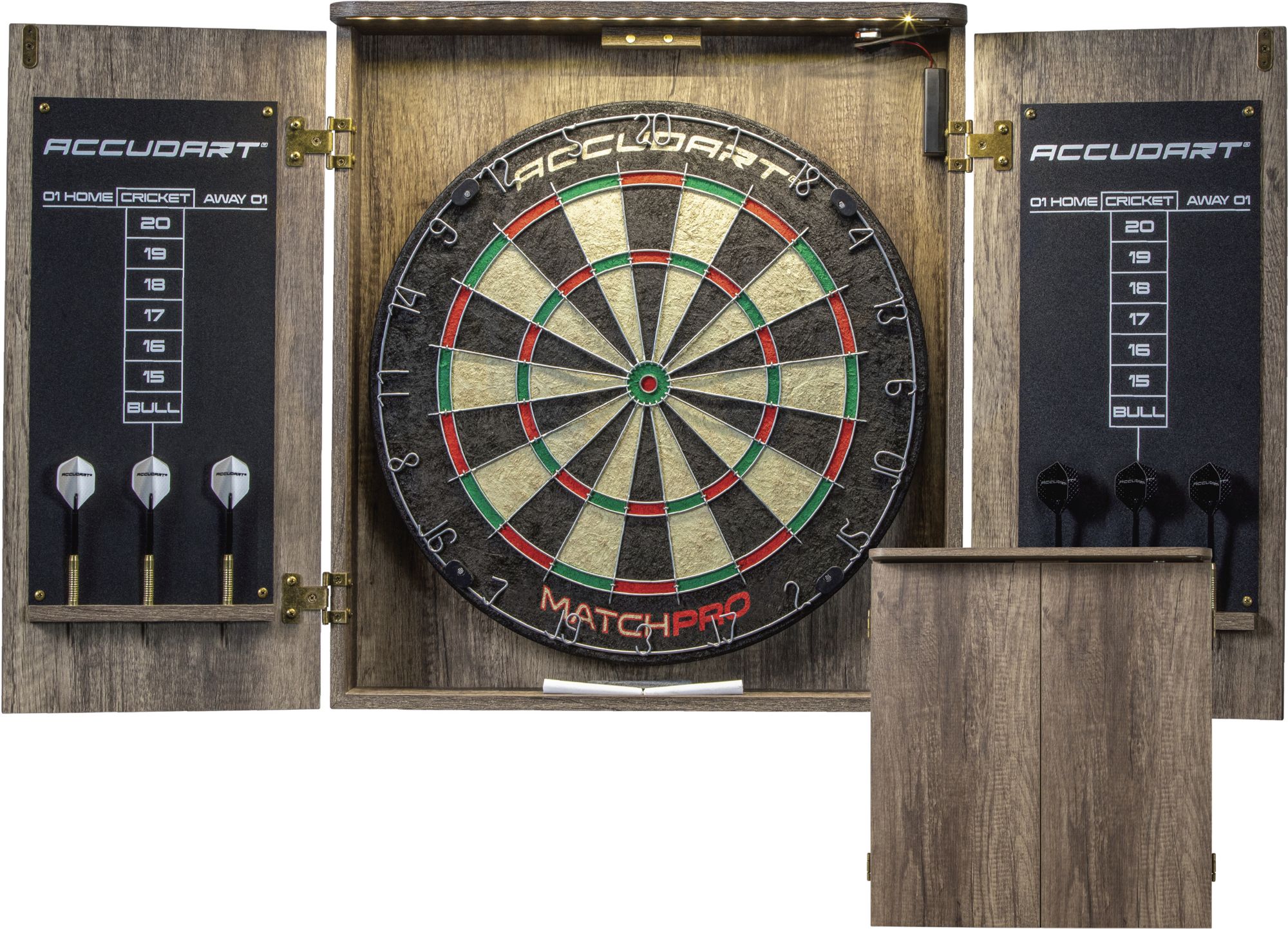 Official sized dart board with a convenient cabinet and LED lighting