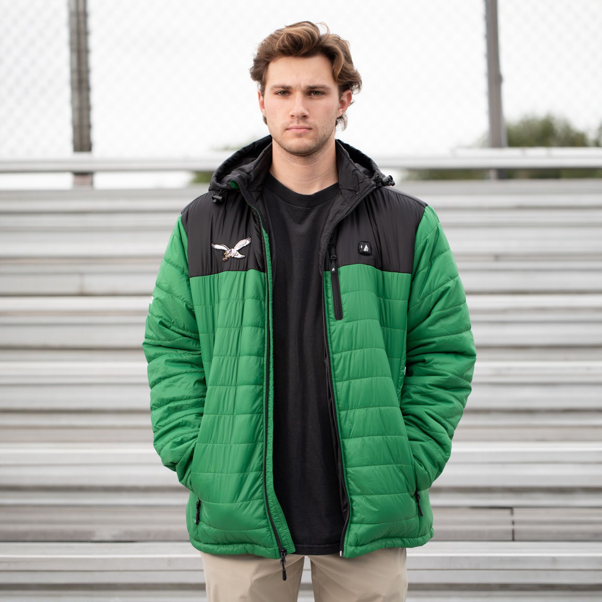 As someone who HATES heavy bulky jackets but LOVES Kelly green Eagles apparel, I was hesitant to buy this last year. I can tell you that, I wear this jacket everyday it’s extremely comfortable and lightweight yet the warmest jacket I have owned and that’s without the heating element. The heating element puts it in a category all by itself, I immediately bought my wife the black Eagles one. Hats Off to ActionHeat they have made an incredible product. P.S. I upgraded the jackets Powerbank, with a more lightweight and more powerful 20,000mah portable charger and it lasts 8+ hours at Maximum heat.