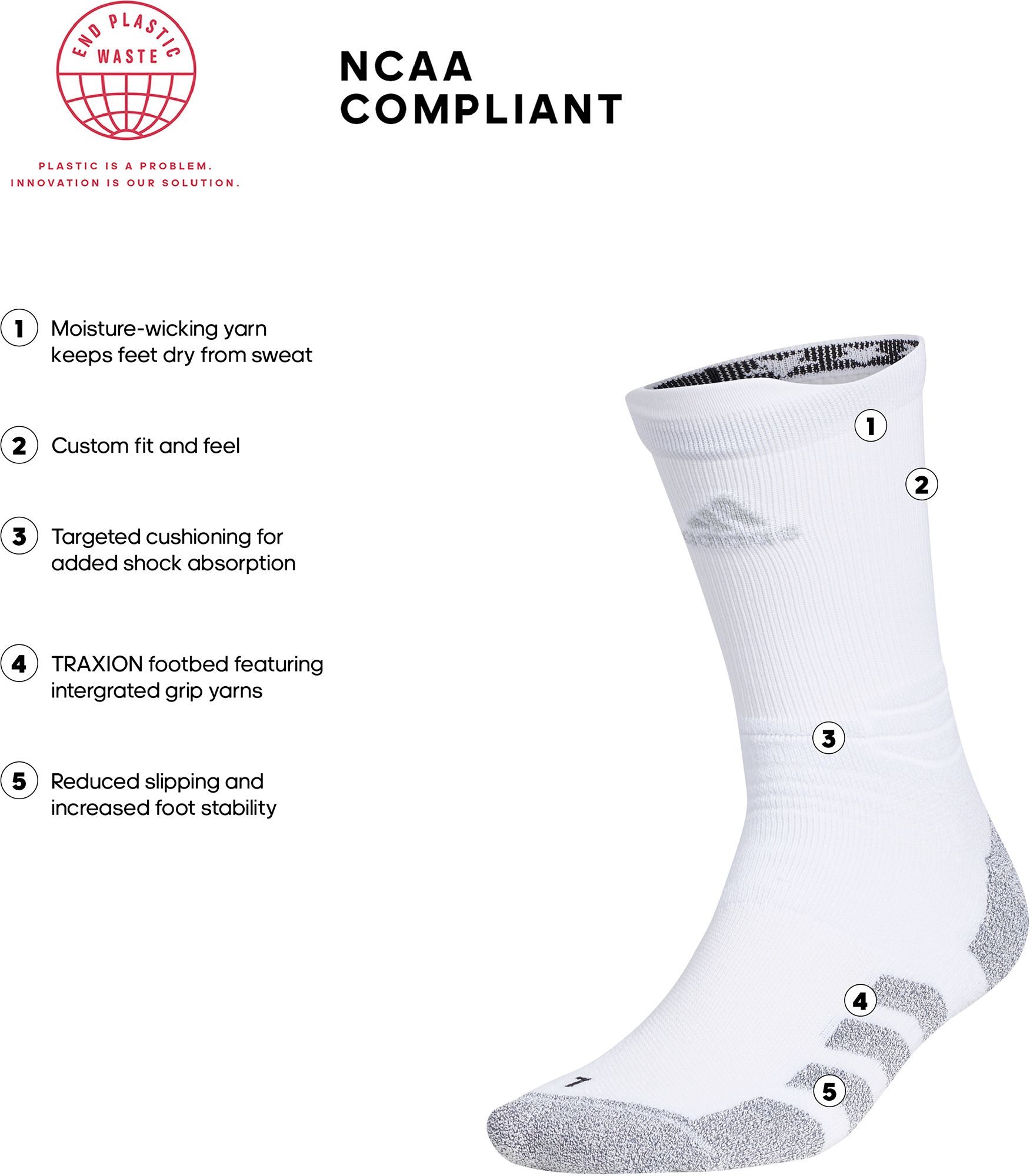 Designed to be worn with cleats, these adidas crew-length socks have a seamless construction that helps reduce friction and irritation. Moisture-wicking yarn keeps feet dry during practices and games. A grippy traxion footbed keeps them locked in place as you move.