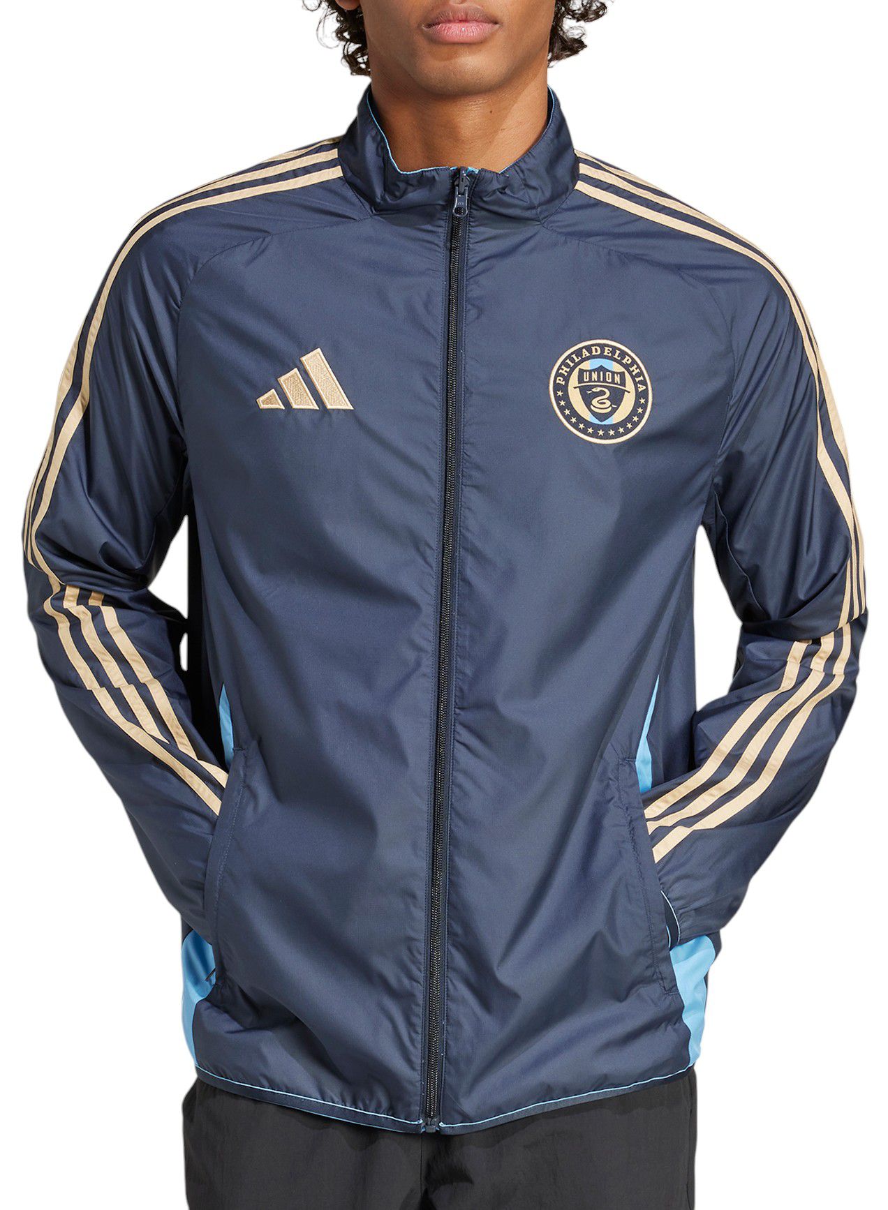 This is a perfect jacket for Union games, at home and away. Comfortable and large enough to accommodate a hoodie underneath for those chilly Spring and Fall evenings at Subaru Park. And it reverses to the away colors, for games in other venues.