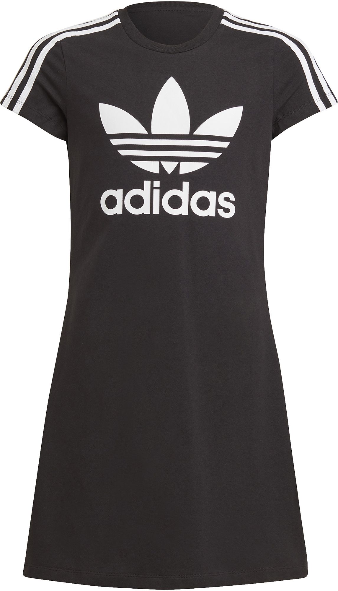 Fluttery, playful, casual, cool. This juniors' adidas dress puts a soft touch on sporty and knows comfort should always come first. Unmistakable 3-Stripes on the sleeves complement a big and bold Trefoil that commands confidence. The soft cotton blend has the perfect amount of stretch to let you move, play and do your thing. Our cotton products support more sustainable cotton farming.