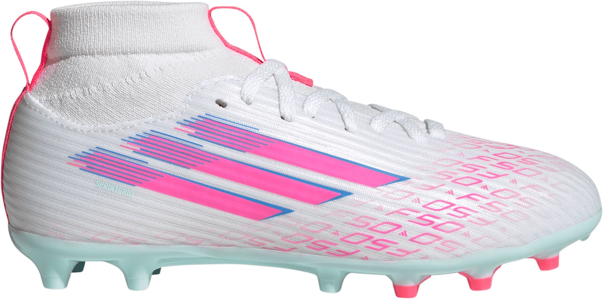 Step up your game with the F50 Sparkfusion League football boots, designed for women. Featuring a mid-cut knit collar that molds to the shape of your foot, these boots offer maximum comfort. Fusionlast ensures a better fit for her with a lower instep, narrower heel, and optimized toe-box volume, while the Sprintplate Fusion outsole supports quick changes of direction, push off support and ease of rotation on both natural and artificial grass. Engineered with a Fiberskin upper and strategically placed 3D lines, these boots enhance ball touch and visual appeal. They combine performance and versatility seamlessly.