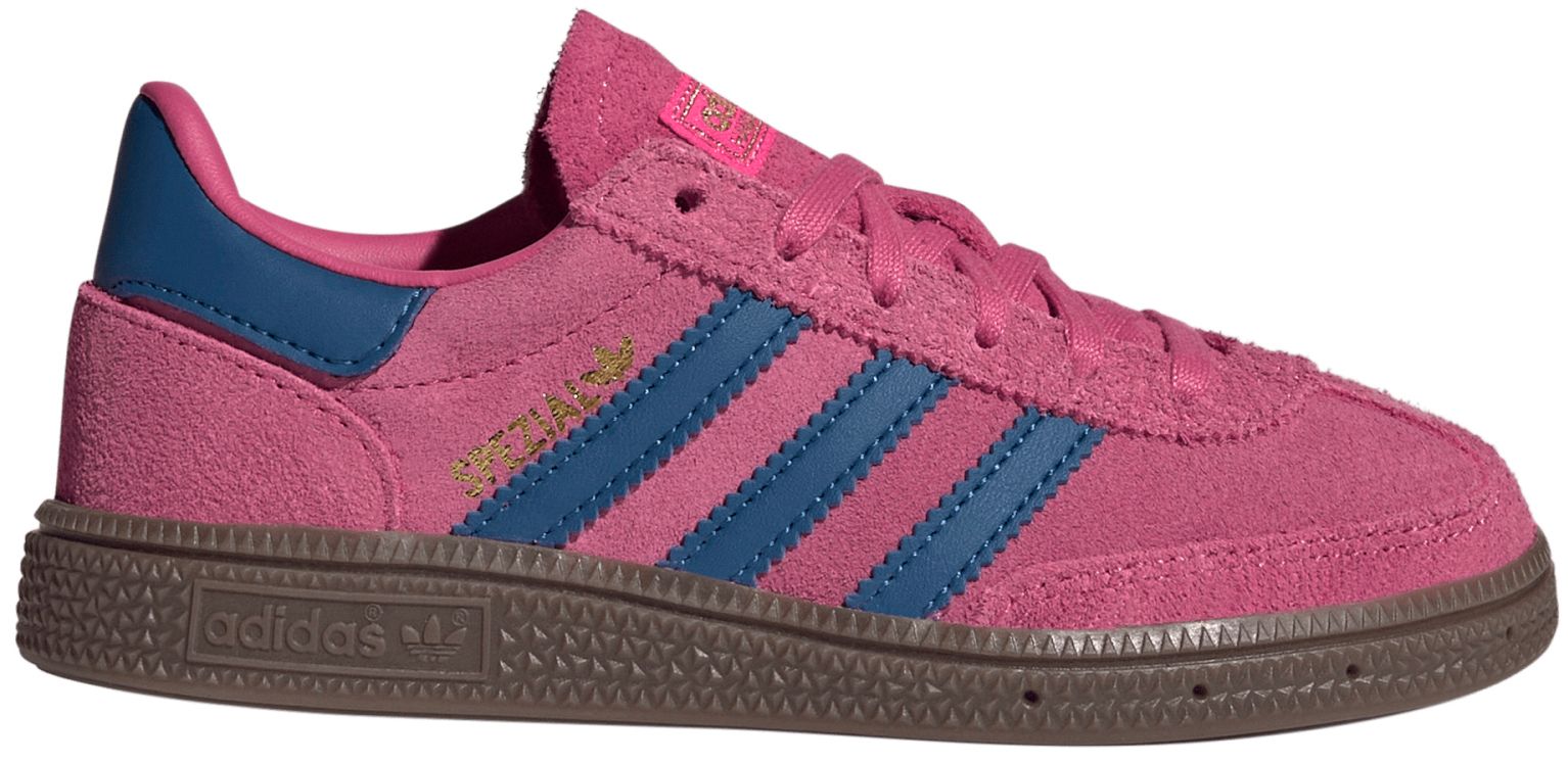 From blacktop to sidewalk, kids need shoes that can keep up. The adidas Handball Spezial is built for kids on the move. Scaled down for growing feet, these retro-inspired shoes bring big style in a small package. Their suede upper and gum rubber sole provide toughness from top to bottom, with grippy traction for all their running and playing. Serrated 3-Stripes, a double-stitched T-toe and classic Spezial branding finish off the look.