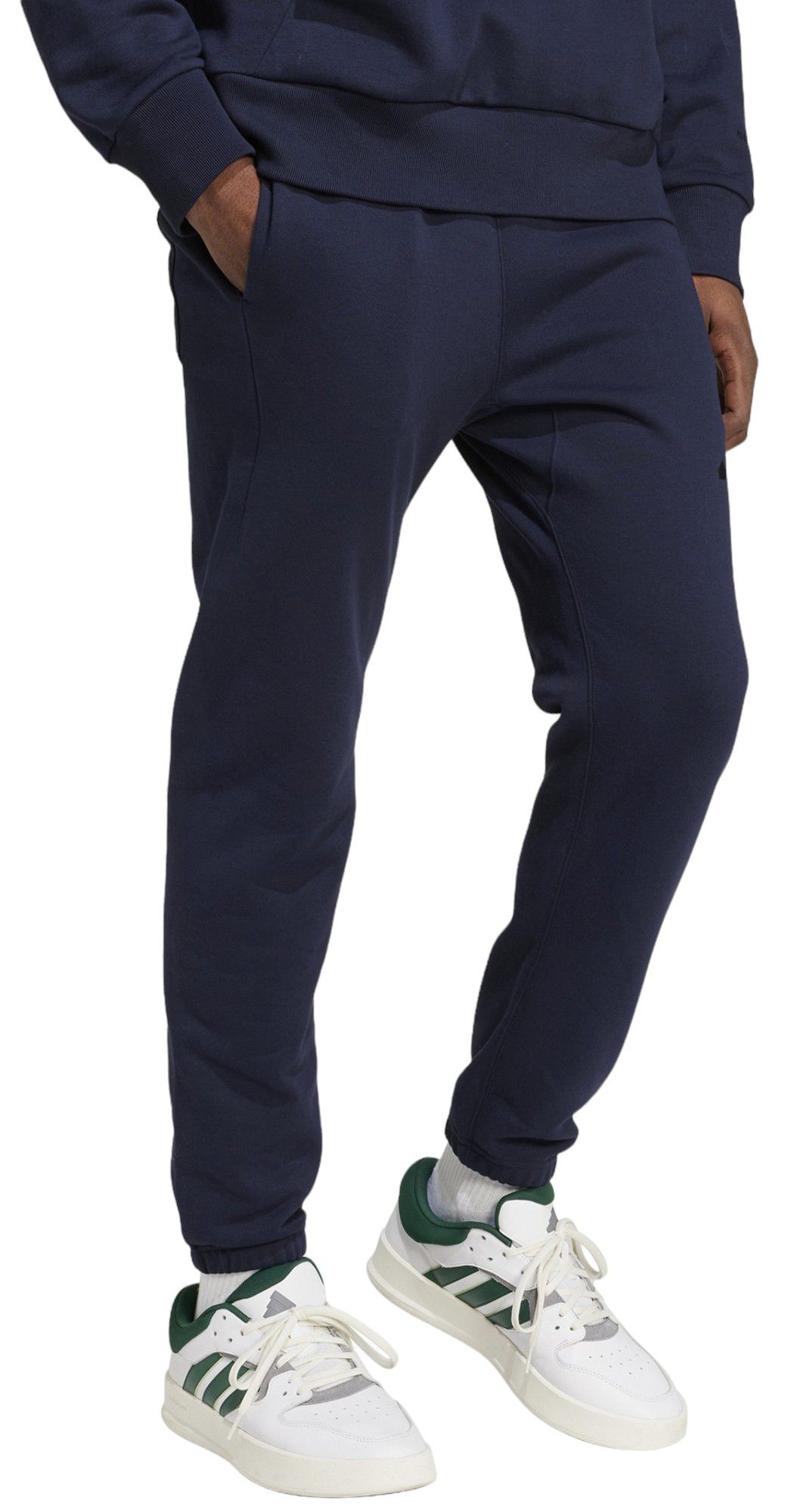 The sweats fit great! They are the length I like. The material is really soft and comfortable. They stretch a good amount and are very stylish. I like the subtly of the adidas logo!