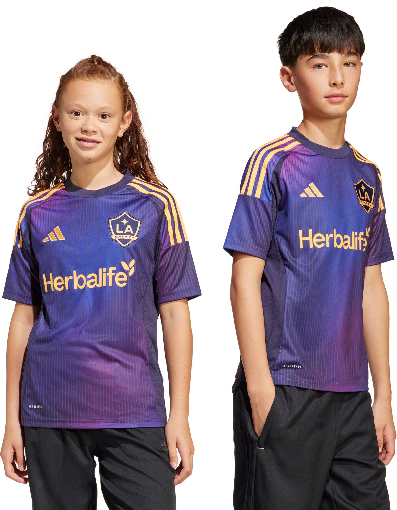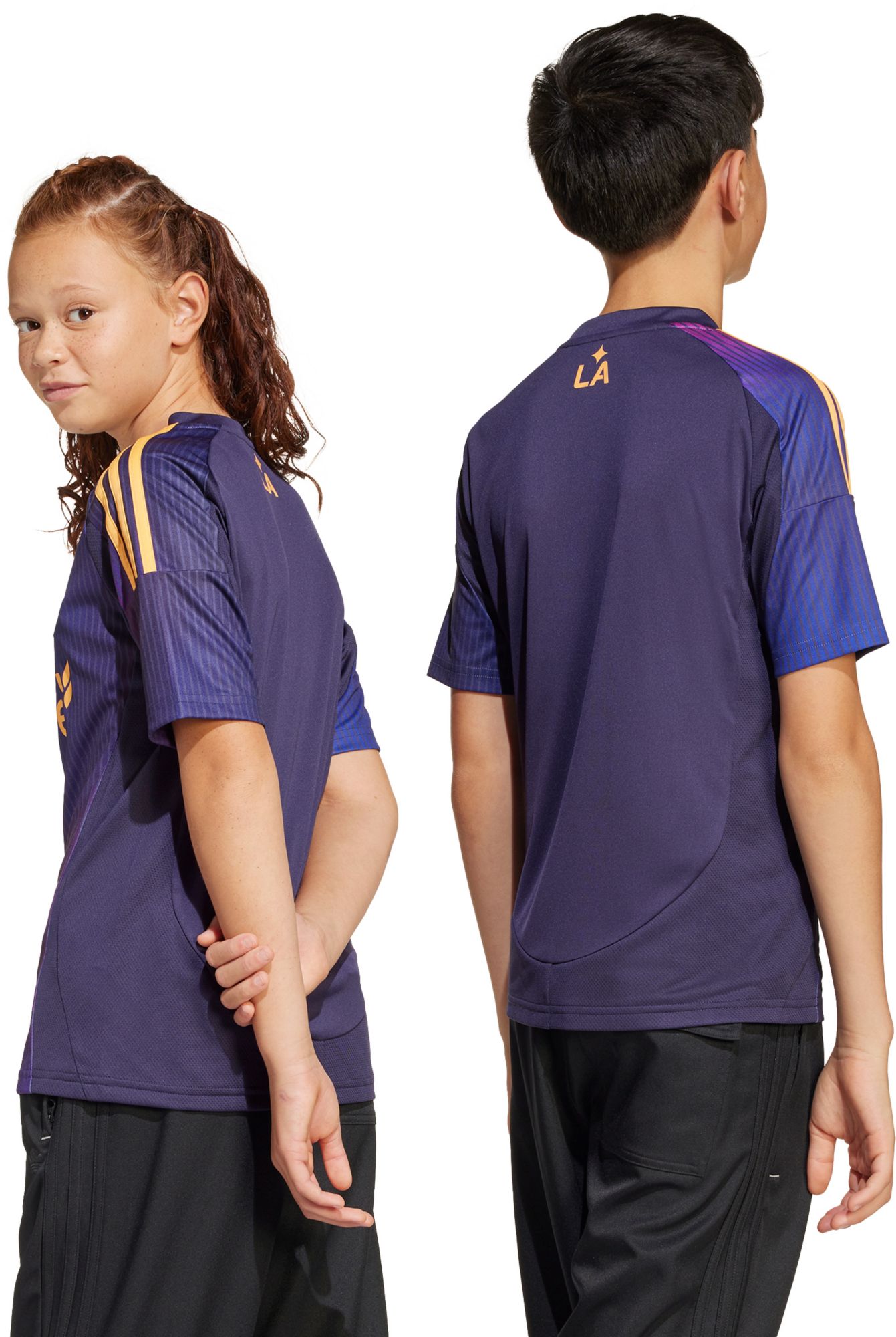 Built to shine, this juniors' adidas LA Galaxy away jersey displays the radiant hues of a spectacular Los Angeles sunset. Soft fabric and moisture-managing AEROREADY combine to keep you comfortable while you shout for your football heroes. An embroidered badge and special sign-off ensure your fandom remains front and centre.This product is made with 100% recycled materials. By reusing materials that have already been created, we help to reduce waste and our reliance on finite resources and reduce the footprint of the products we make.