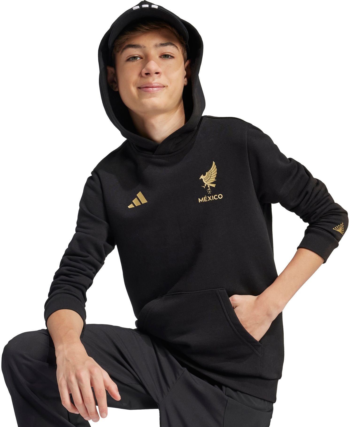 Let your football pride shine every time you pull on this juniors' adidas Mexico hoodie. Belonging to a special collection headlined by an eye-catching match kit, it features a golden 3 Bar Logo and team badge on the chest. The French terry fabric and ribbed cuffs ensure you stay comfortable while you treasure your team.