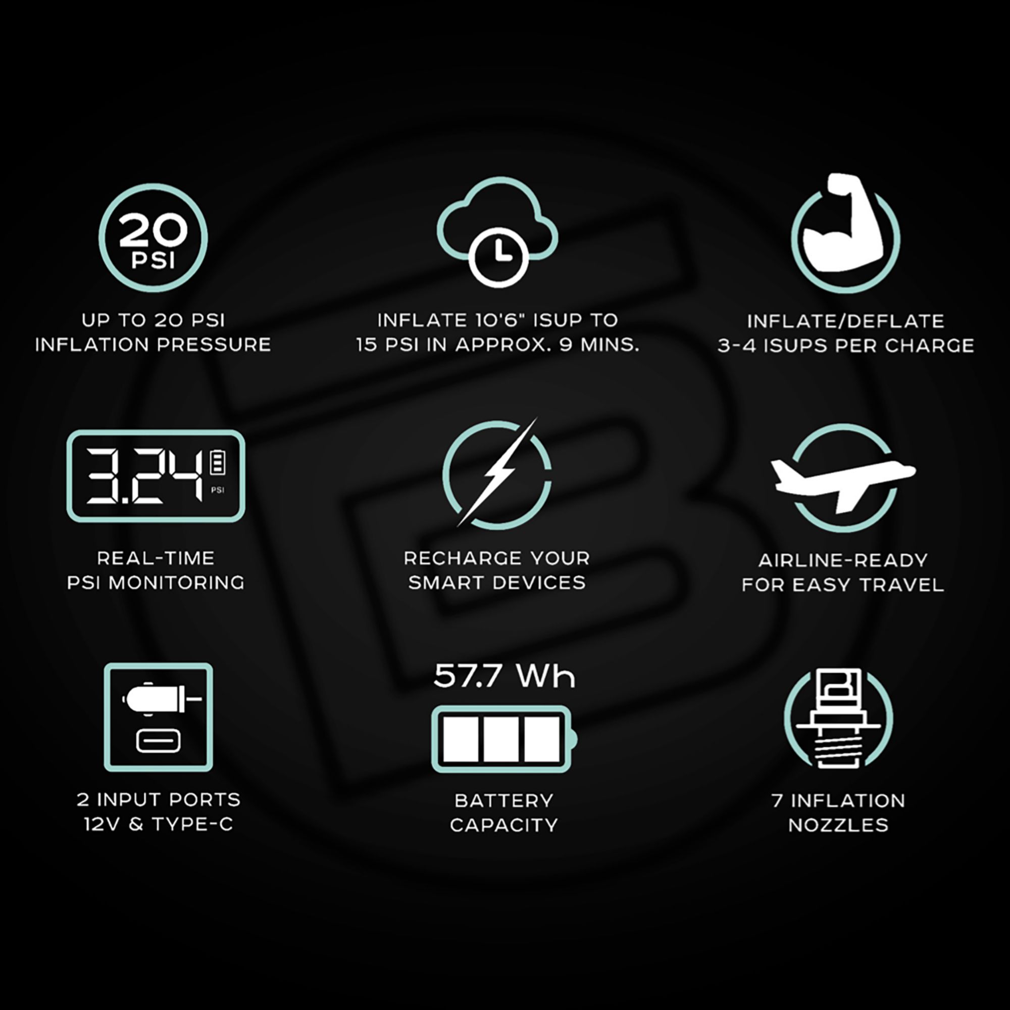 Powerful, portable, and built for adventure—the AeroPump Mini Rechargeable takes hassle-free inflation to the next level With up to 20 PSI inflation pressure and real-time PSI monitoring, it inflates a 10'6" iSUP to 15 PSI in about 9 minutes A single charge can handle up to 4 boards, and dual input ports (12V & USB-C) keep it ready to go Plus, it doubles as a power bank to recharge your smart devices Compact, airline-ready, and equipped with seven nozzles, it's the perfect travel companion for effortless inflation anywhere