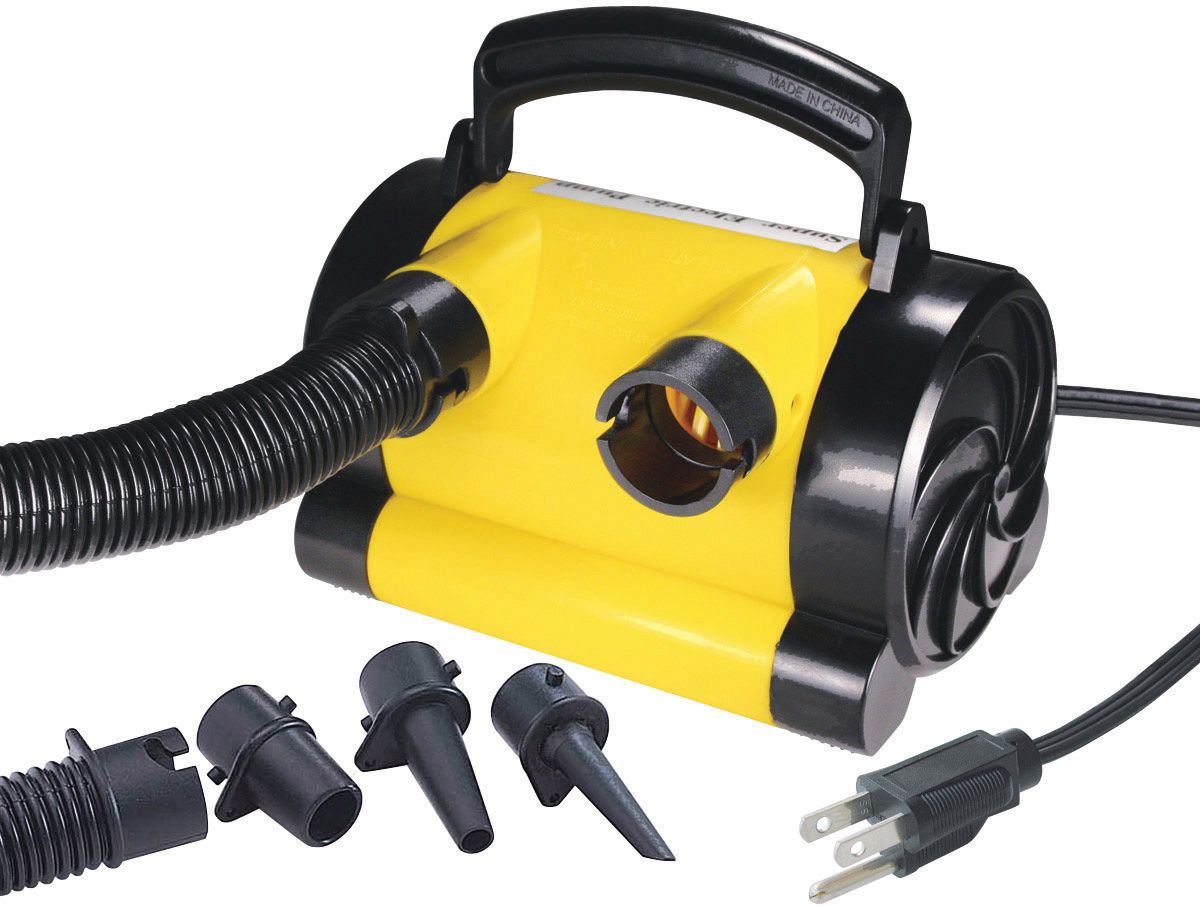 This 120 volt canister style air pump from Airhead® inflates and deflates towables, pools, air mattresses and beach toys. The accordion-style hose locks onto the pump and valve fittings, eliminating annoying disconnections. Three universal valve fittings fit all popular valves. For added convenience, there’s a carry handle and a 10 ft. long power cord. Volume is 300 liters per minute, maximum pressure is .92 psi. It draws 1.6 amps per 170 watts.