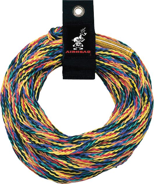 Airhead 2 Ride Tube Tow Rope is a 3/8” 16-strand braided tow rope that is rated at 2,375 pounds tensile strength. There’s a 6” loop spliced at each end. A Rope Keeper is included for tangle-free storage. Designed specifically for 1 and 2 rider tubes.