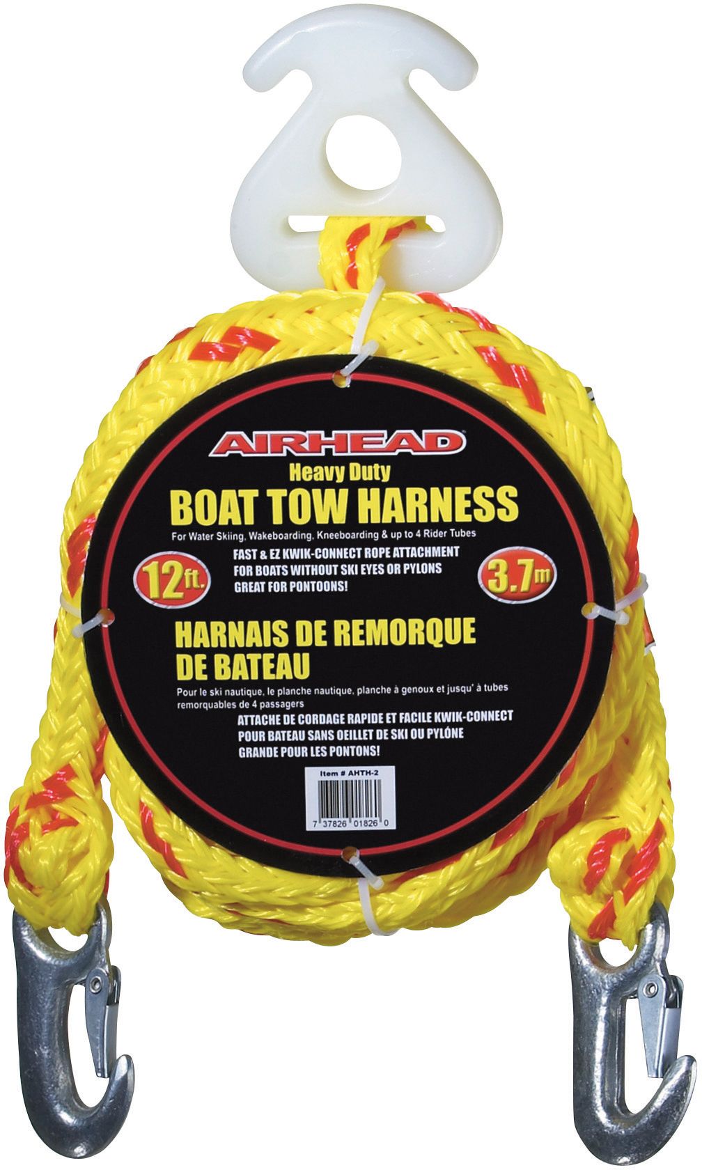 This Airhead Heavy Duty Tow Harness is perfect for pulling skiers, wake boarders and up to 4 rider towables. Simply clip it onto your boat with the 5,000-pound tensile strength hooks, and attach your ski or tube rope to the heavy duty Kwik-Connect. A 6” float keeps the Kwik-Connect floating on top, away from your propeller. This tow harness is12 feet long, perfect to fit larger boats and pontoons.
