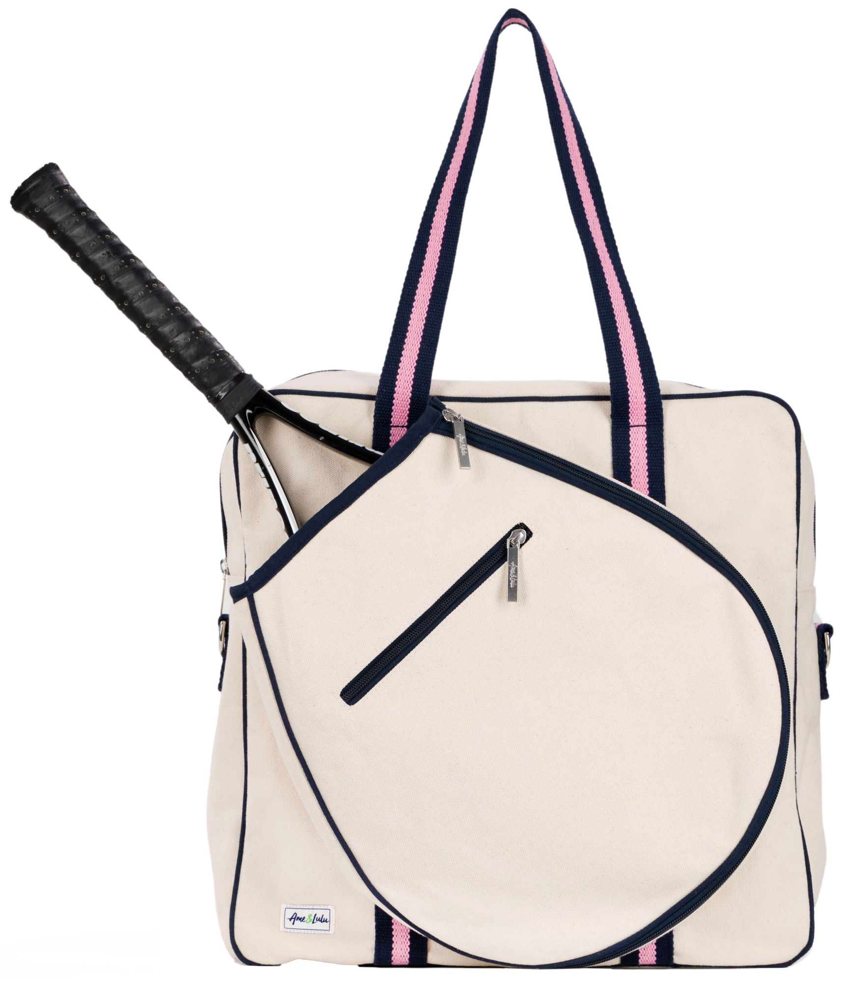 The Hamptons Tennis Tour Bag is accented with cotton webbing handles and a chic silhouette. The removable adjustable strap makes it easy to wear this bag as a crossbody. On the interior, there are two mesh pockets for water and tennis balls and an interior zip to keep valuables stored away during your match.