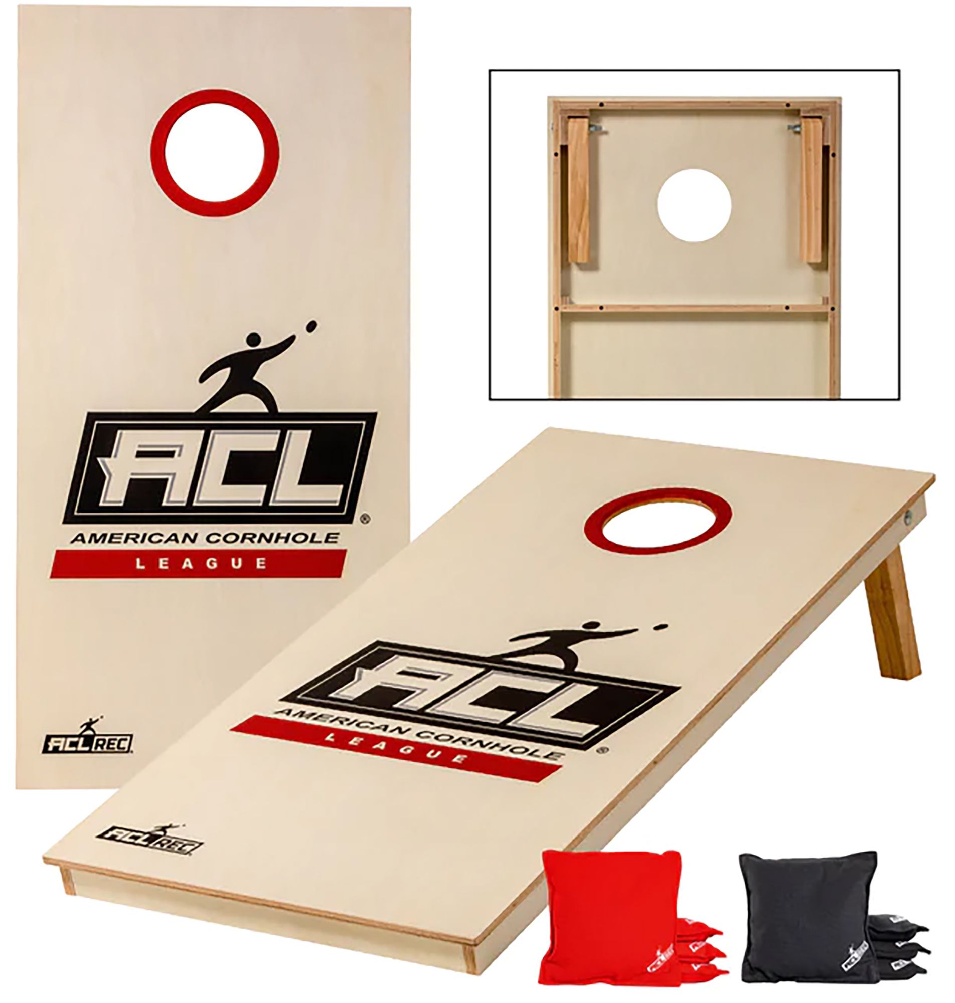 The only officially licensed and certified American Cornhole League® REC board for tailgate and backyard fun! A quality 12mm, 100% sanded Baltic Birch board surface complete with oversized, solid wood legs, while dual cross beam supports prevent excess board movement. 8 ACL® REC bags are included; 4 red and 4 black, crafted from duck cloth canvas materials. 3/8” thick carriage bolts with lock nuts securely fasten the legs to the frame to ensure exacting standards. Bring the fun to your next get-together with the ACL® REC cornhole board. Official Regulation: 48” x 24”.