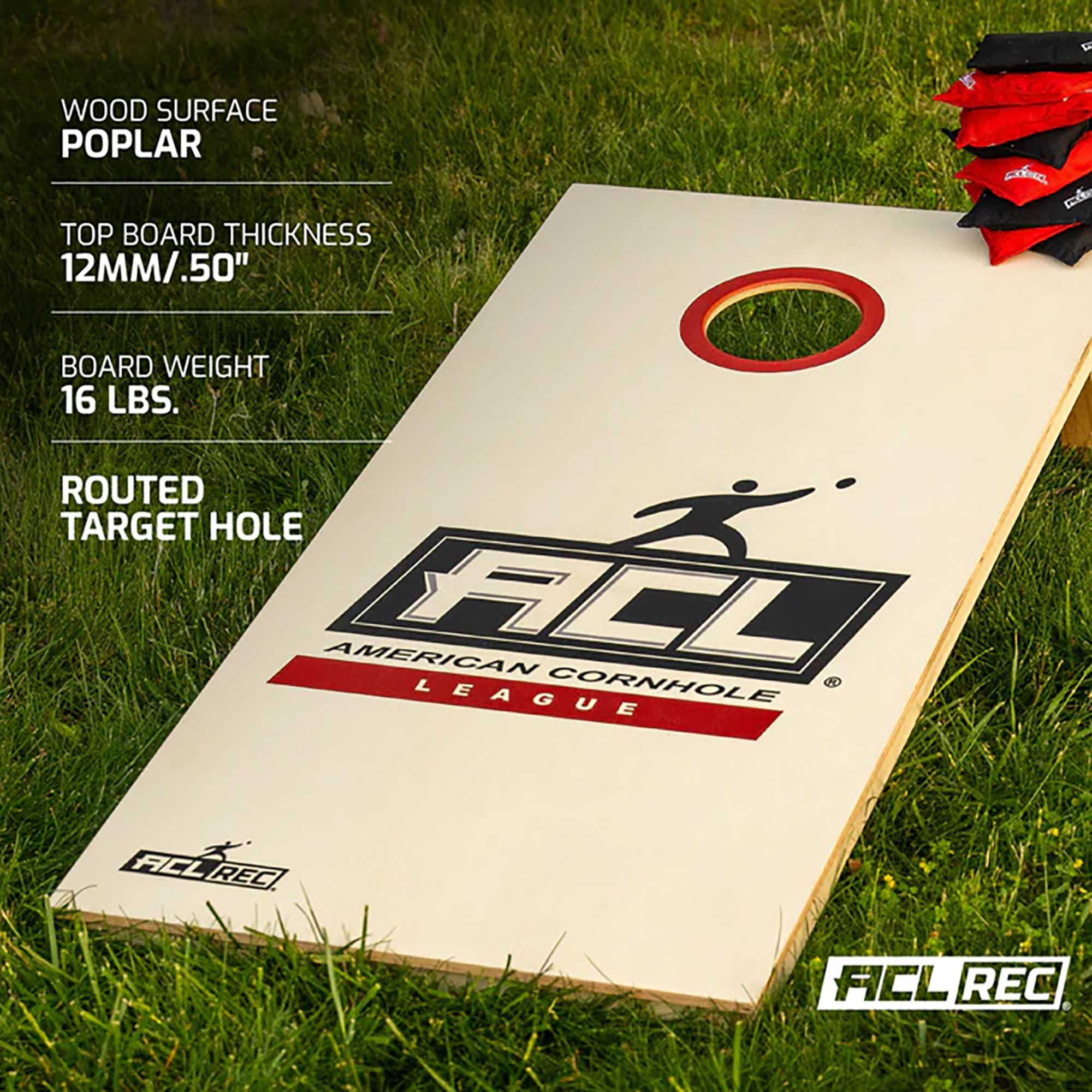 The only officially licensed and certified American Cornhole League® REC board for tailgate and backyard fun! A quality 12mm, 100% sanded Baltic Birch board surface complete with oversized, solid wood legs, while dual cross beam supports prevent excess board movement. 8 ACL® REC bags are included; 4 red and 4 black, crafted from duck cloth canvas materials. 3/8” thick carriage bolts with lock nuts securely fasten the legs to the frame to ensure exacting standards. Bring the fun to your next get-together with the ACL® REC cornhole board. Official Regulation: 48” x 24”.