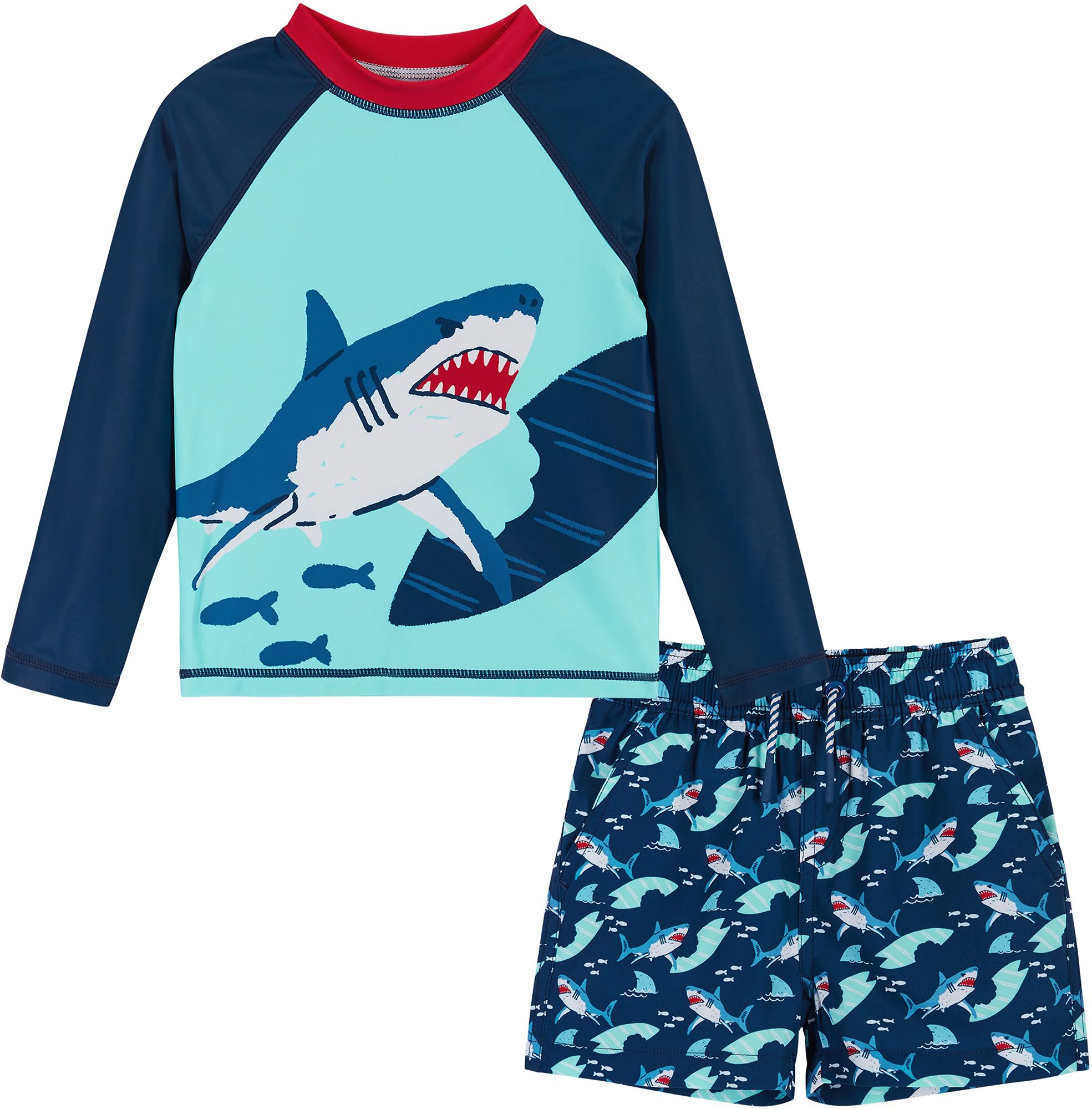 Let your toddler take on the waves in this bold animal-themed rashguard and boardshort set. Designed for all-day fun in the sun, the rashguard features comfortable raglan sleeves and a fierce graphic, while the matching boardshorts offer a secure fit and fast-drying performance. Built-in UPF 50+ protection keeps him safe and stylish.