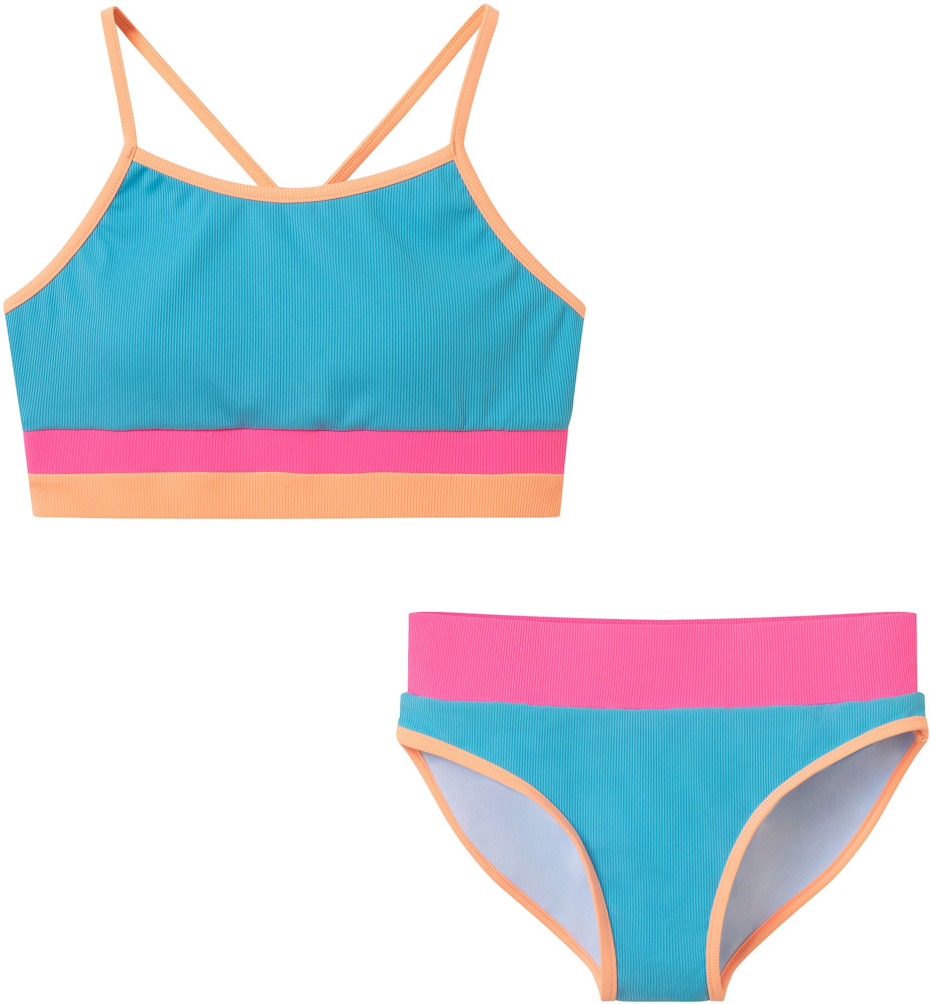 Bright, bold, and totally beach-ready — this ribbed colorblock bikini is made for tweens who love making a splash in vibrant style. With sporty vibes, soft rib texture, and fun pops of aqua, pink, and peach, this set keeps her comfortable, confident, and ready for every sunny adventure.