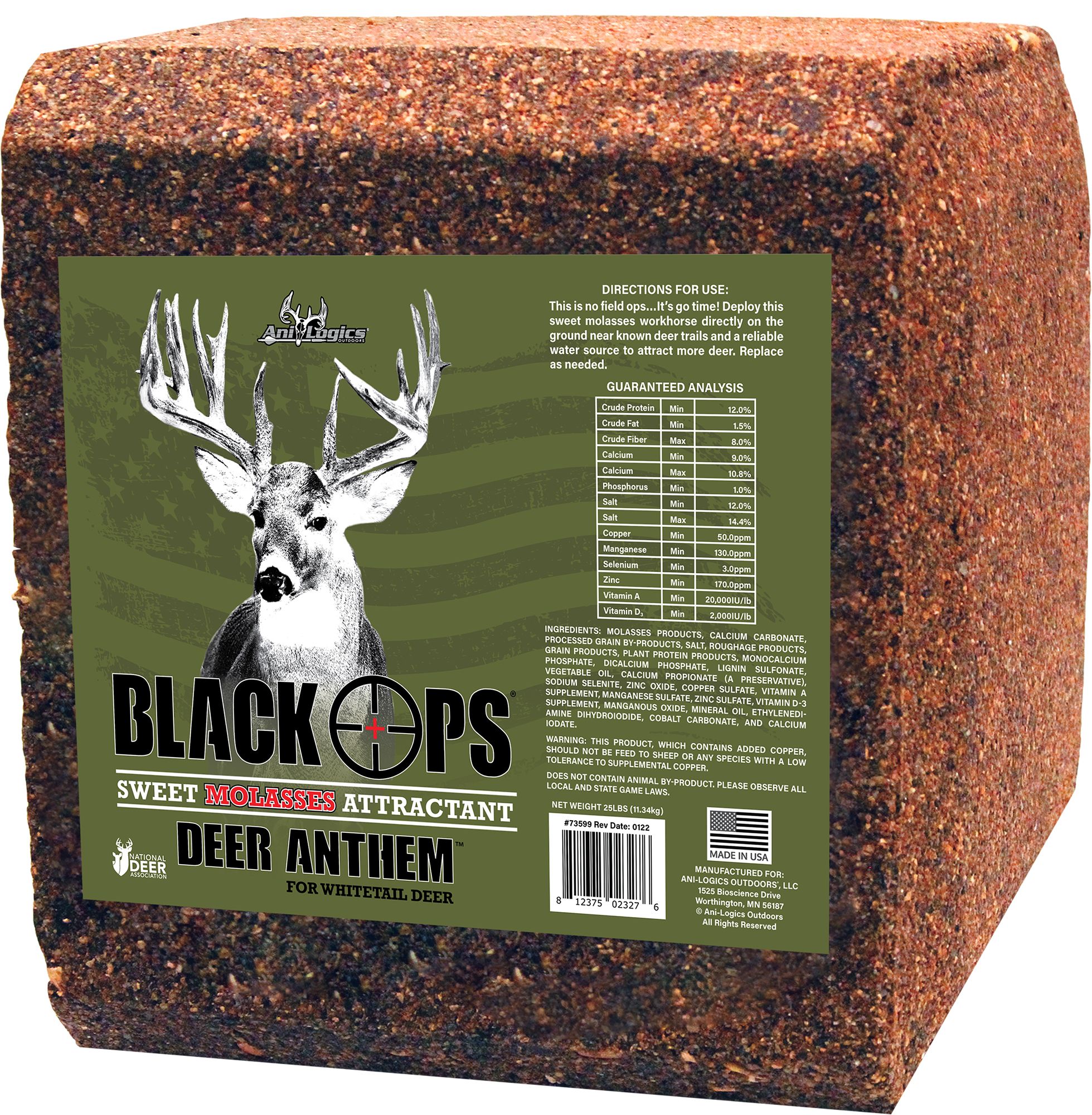 Take covert deer attraction to the next level by deploying Black Ops® Deer Anthem™ Molasses Block. Designed to give hunters stealthy attraction that goes under the radar. While the rich, dark, sweet molasses tempts not only your whitetails but bear and hogs as well!
