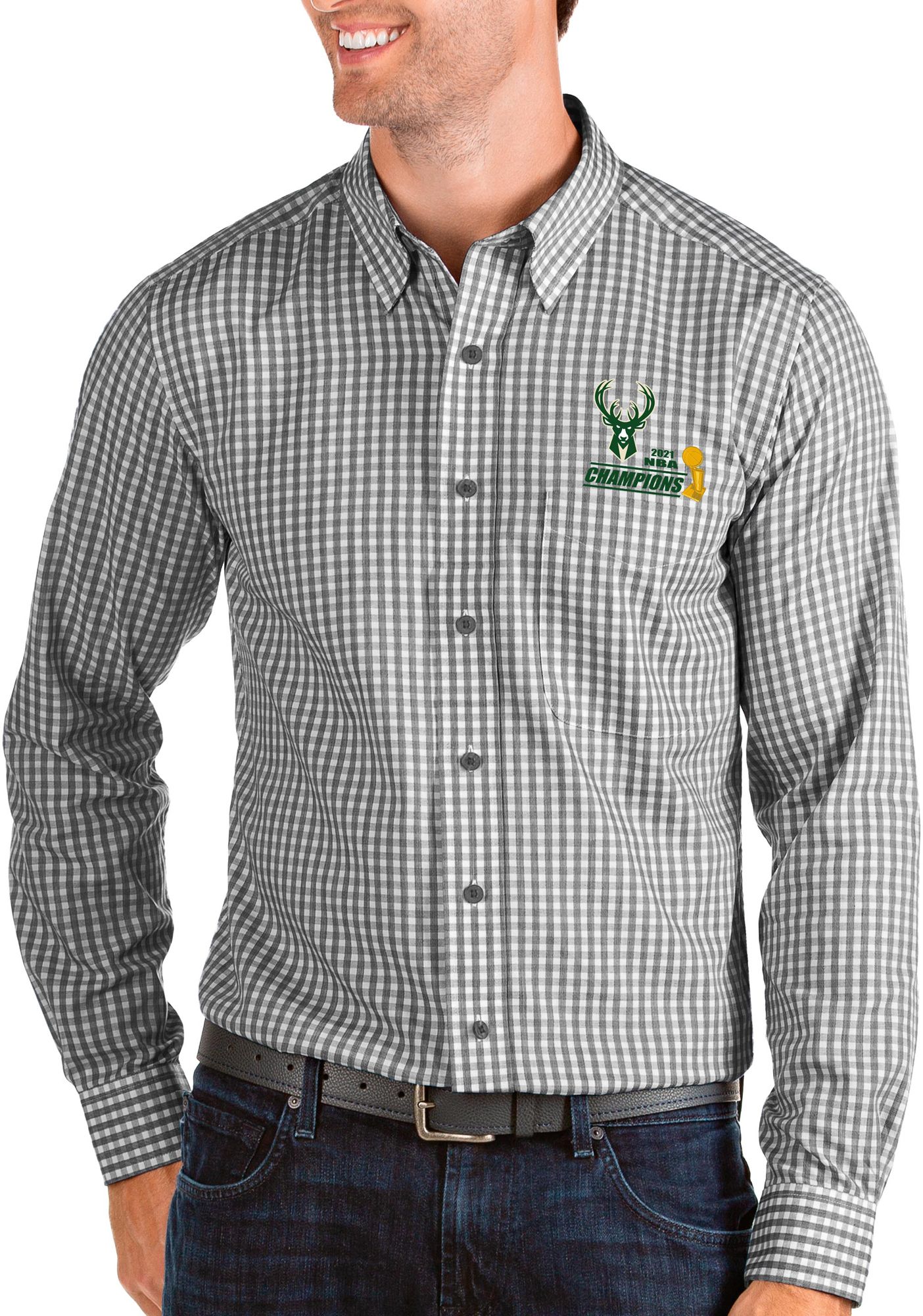 Antigua Men's 2021 NBA Champions Milwaukee Bucks Structure Button Down Black Long Sleeve Shirt