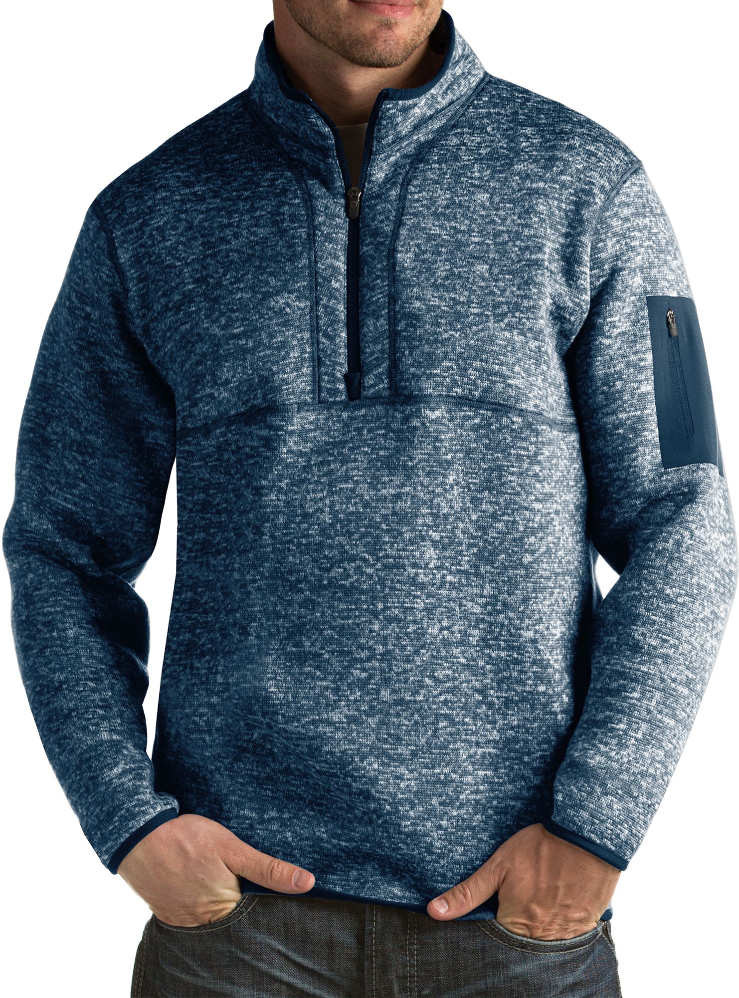 For the ultimate in warmth and performance, add the Antigua Fortune Pullover to your closet. Constructed with brushed back heather sweater knit fabric, the Fortune ensures you stay warm and comfortable in colder conditions. The dyed to match coverstitch and binding at the collar, cuffs and bottom hem add a sharp look, while the welded sleeve pocket provides secure storage space.