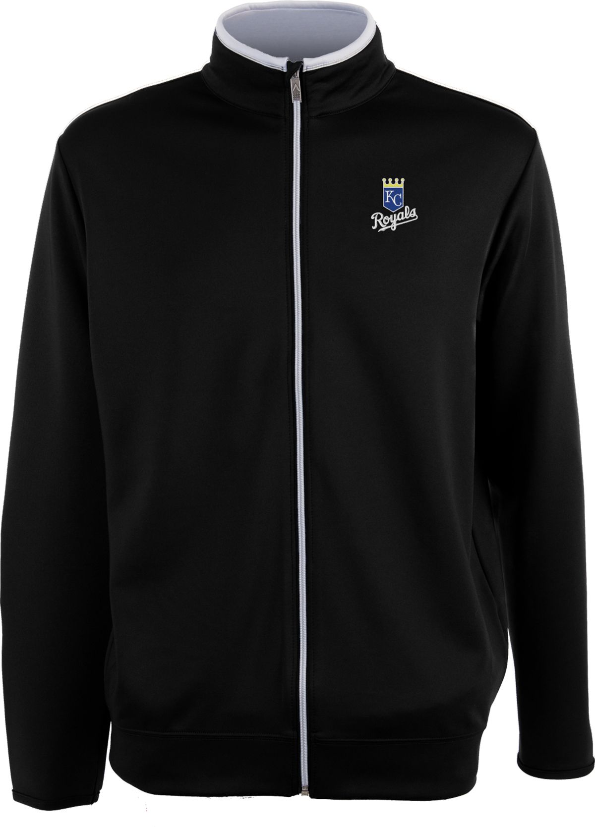 Bring on the cooler temps of the Postseason with the Antigua® Kansas City Royals Leader Full-Zip Jacket. Made from polyester fabric, this Antigua® jacket will keep you warm while you cheer on the Royals this season. Your dedication is made clear with an embroidered Royals logo on the left chest. It has a stylish look with a contrast full-zip front, stand up collar and contrast coloring inside the neckline.