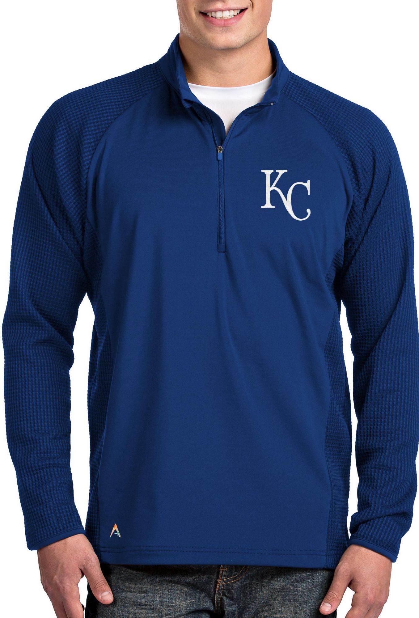 Stay dry as you cheer your team with the Antigua® Kansas City Royals Performance Quarter-Zip Pullover featuring moisture-wicking Desert Dry™ Xtra-Lite D²XL technology.