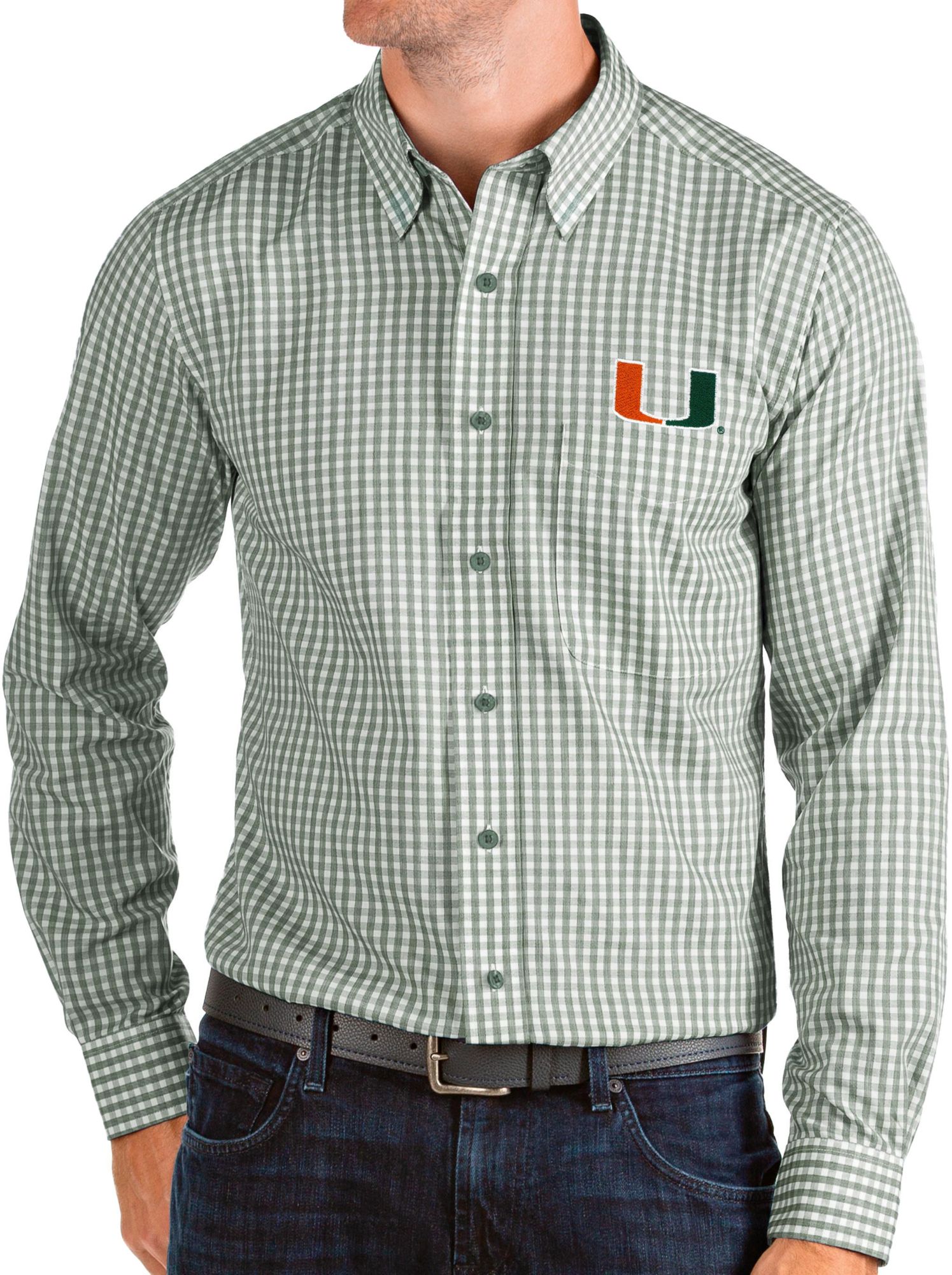 Antigua Men's Miami Hurricanes Green Structure Button Down Long Sleeve Shirt