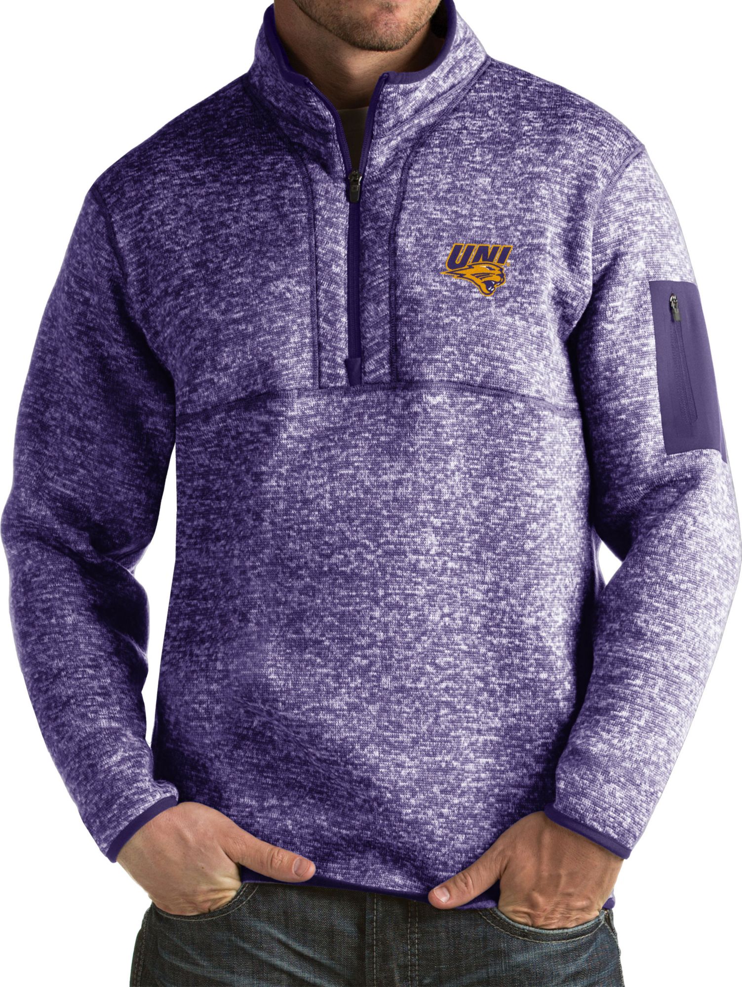 Take on the cold while cheering on the Panthers in the Antigua Men's Northern Iowa Panthers Fortune Pullover Jacket.