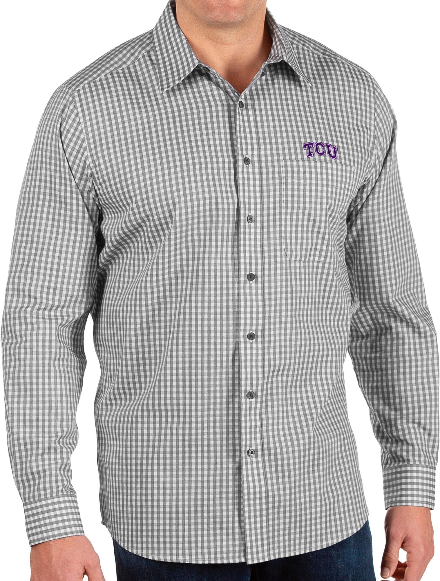 Add Horned Frogs class to your game day gear with the Antigua® Men’s TCU Horned Frogs Structure Button Down Long Sleeve Shirt.