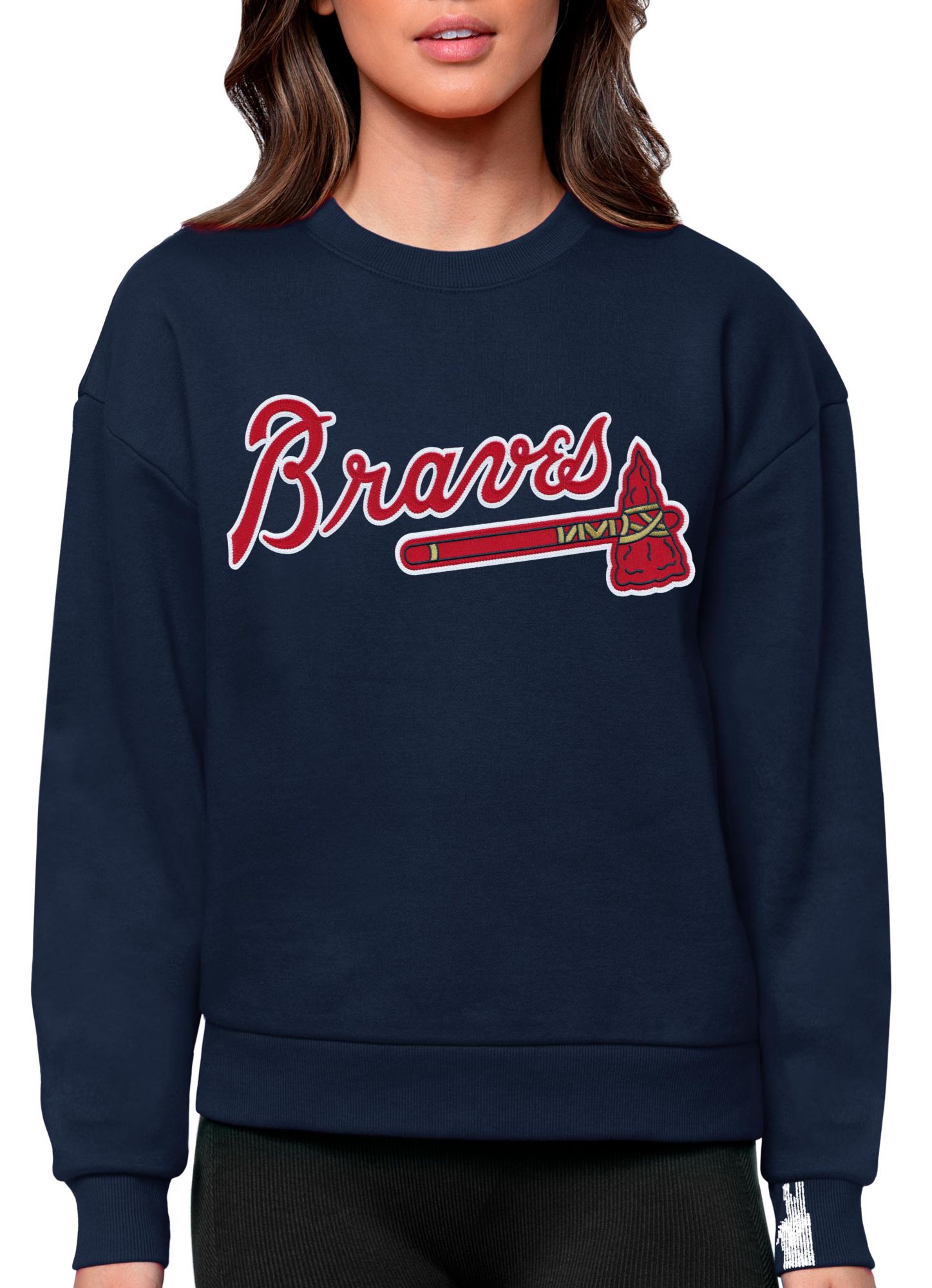 Antigua Women's Atlanta Braves Navy Victory Crew Pullover