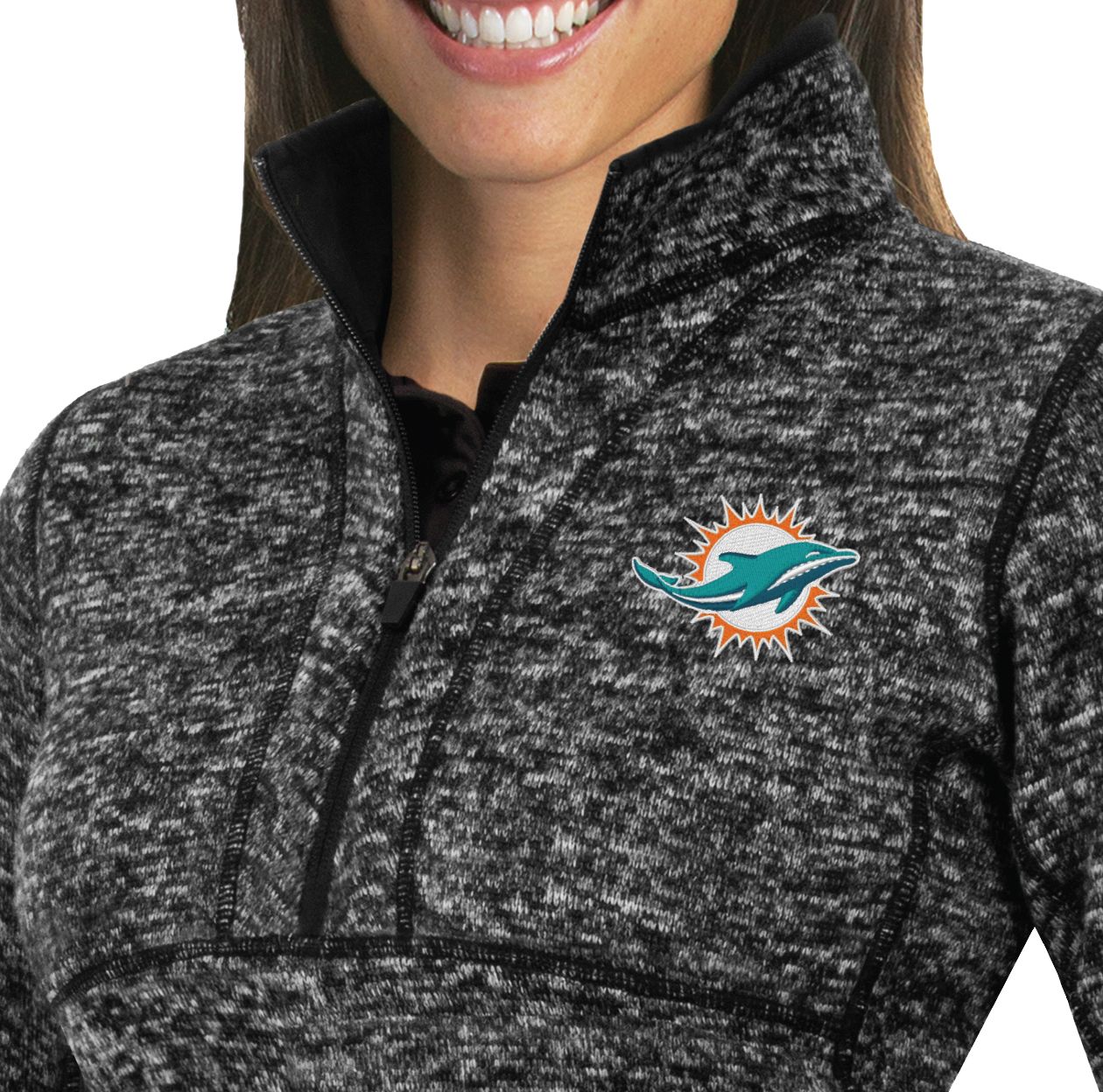 Great for layering in the winter or sporting on its own at the tailgate, the Antigua® Miami Dolphins Fortune Pullover Jacket shows your NFL allegiance in complete comfort, thanks to soft, brushed-back fleece and the mock neck design.