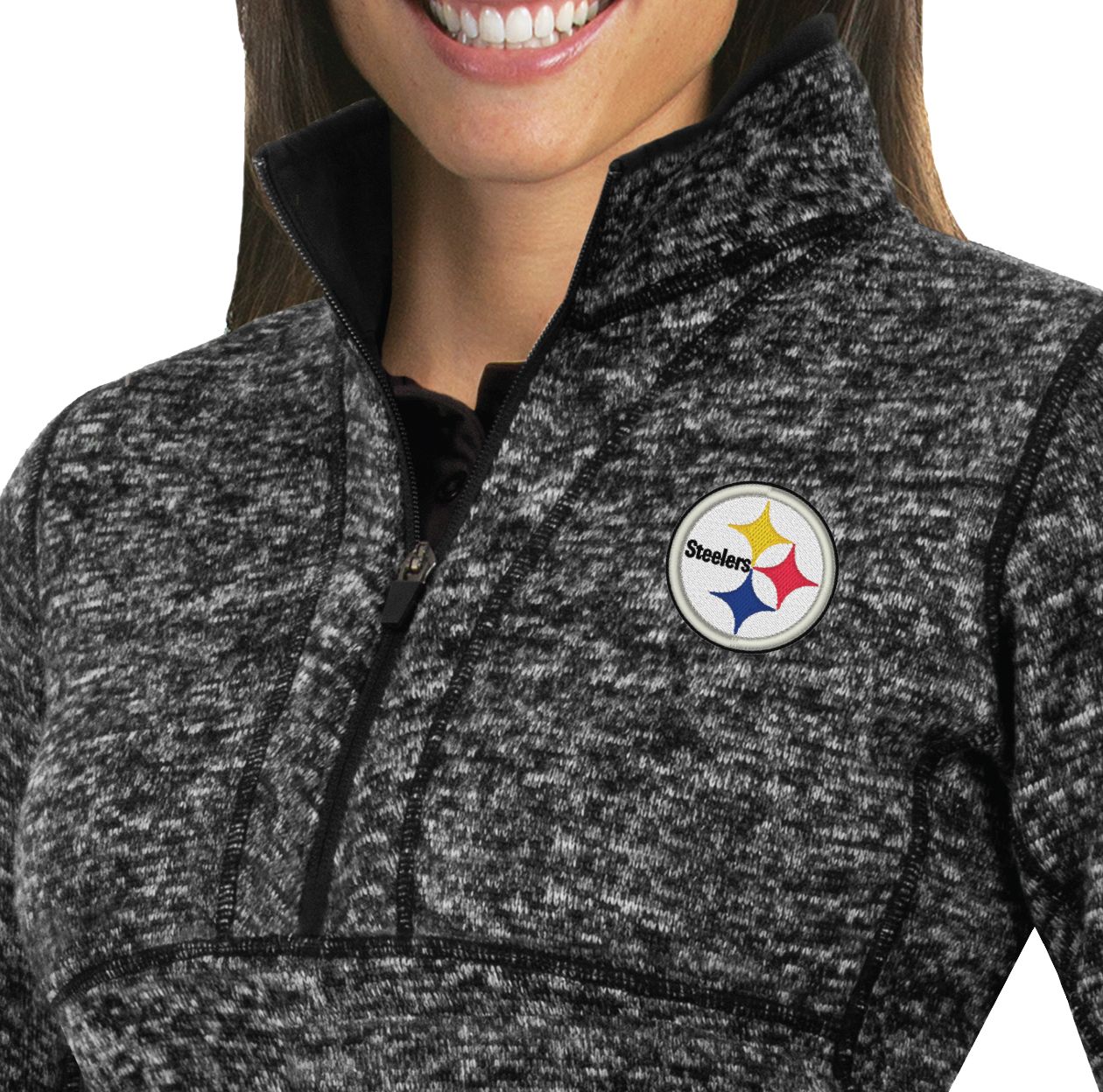 Great for layering in the winter or sporting on its own at the tailgate, the Antigua® Pittsburgh Steelers Fortune Pullover Jacket shows your NFL allegiance in complete comfort, thanks to soft, brushed-back fleece and the mock neck design.