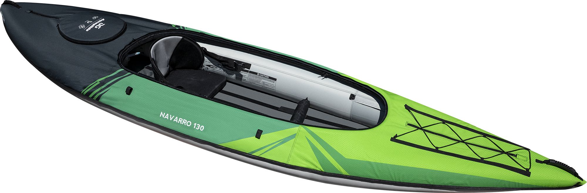 Featuring a versatile design, the Aquaglide® Navarro 130 Inflatable Kayak is made with a drop stitched floor, HexShell covered pontoons, quick release fin and removable zip on deck. In addition, this kayak is equipped with a seat adjustment system, zip open dry compartments and accessory strap.
